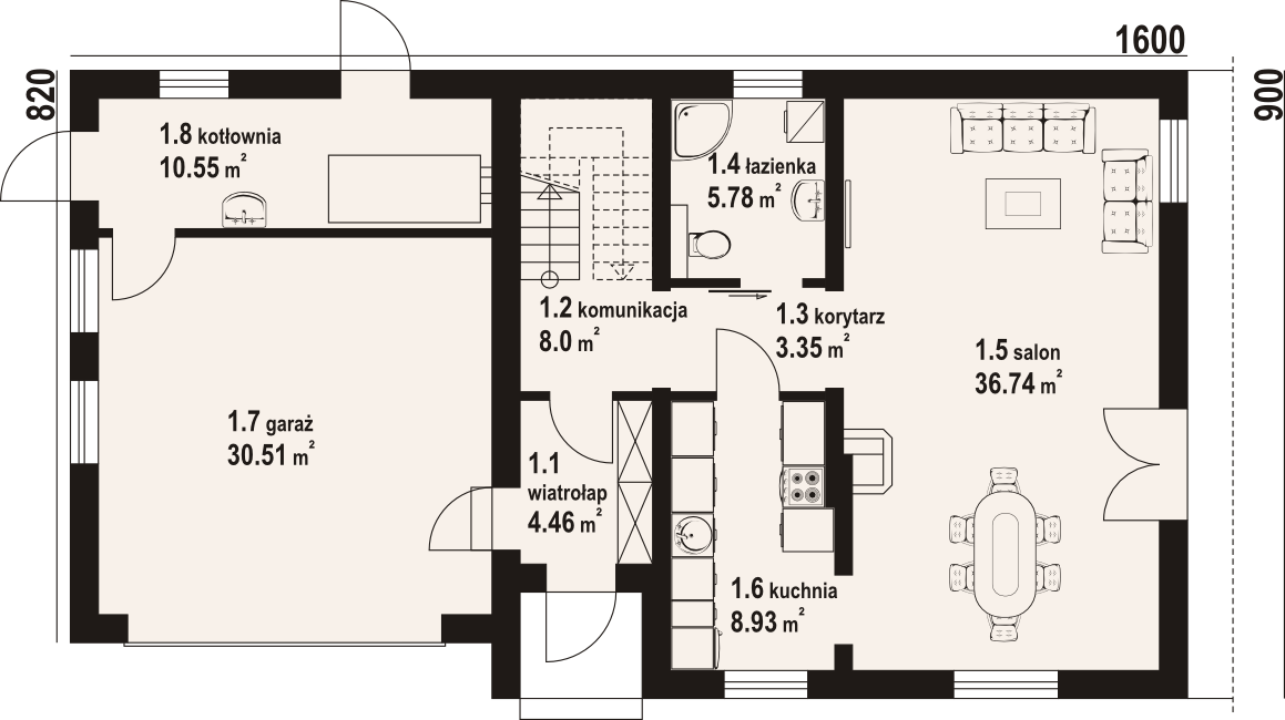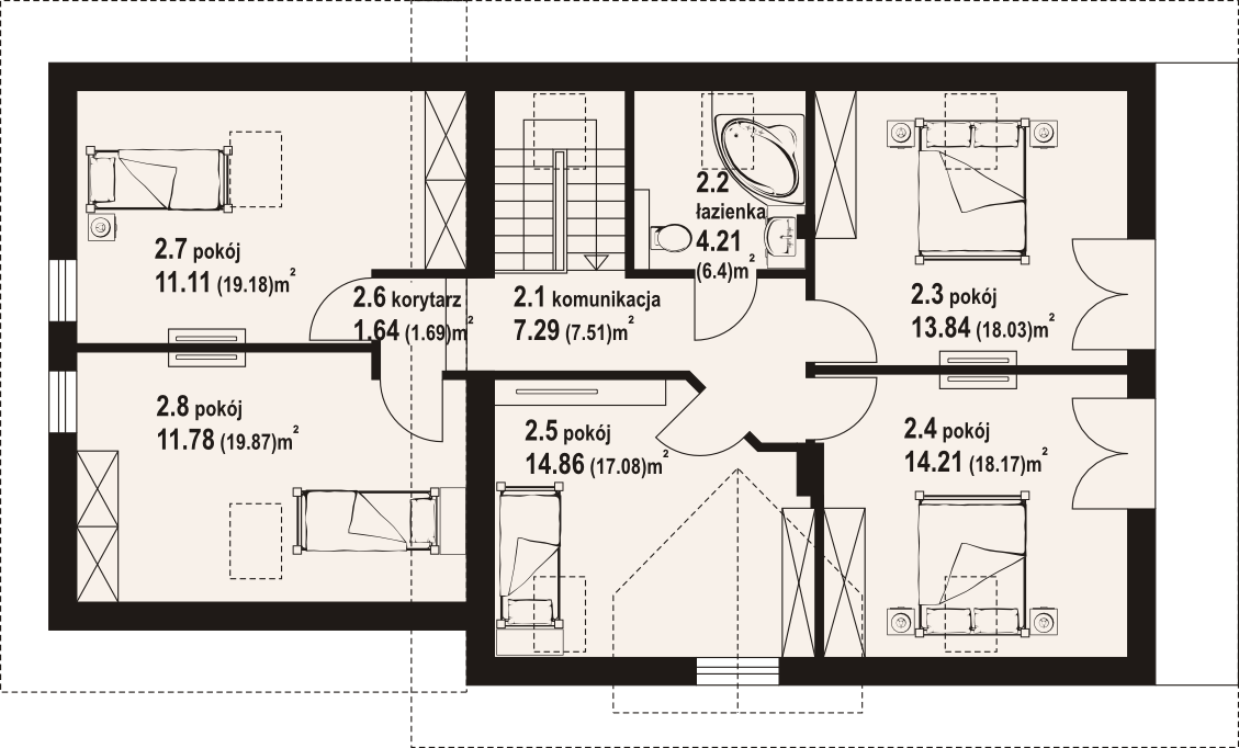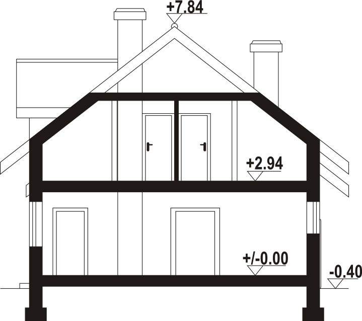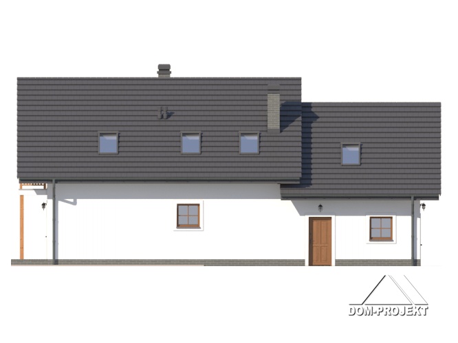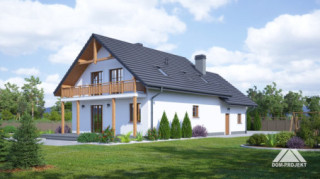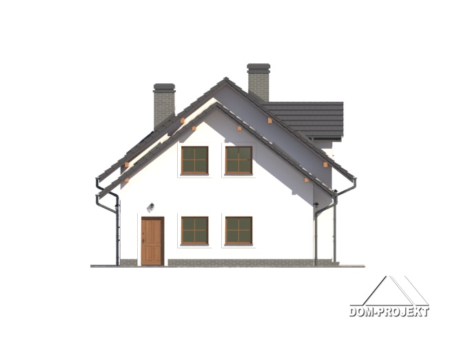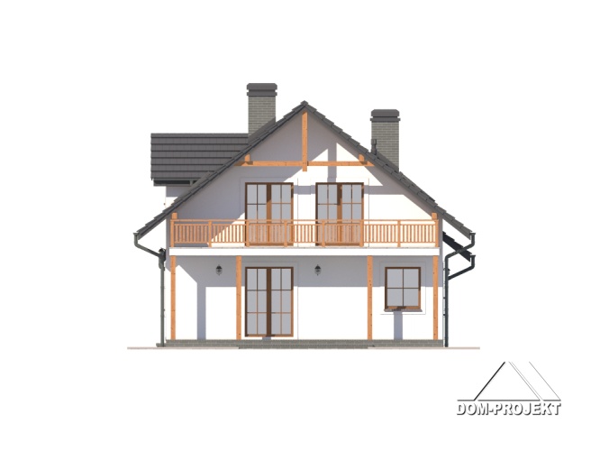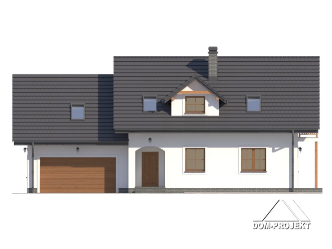 Dom z poddaszem mieszkalnym. Duży salon z kominkiem i wyjściem na taras, kuchnia, łazienka, komunikacja, wiatrołap, garaż na dwa samochody i kotłownia. Na poddaszu pięć pokoi, łazienka, komunikacja i balkon. Zwarte bryła budynku i dach dwuspadowy sprzyjają szybkiej i taniej budowie i niskim kosztom eksploatacji.