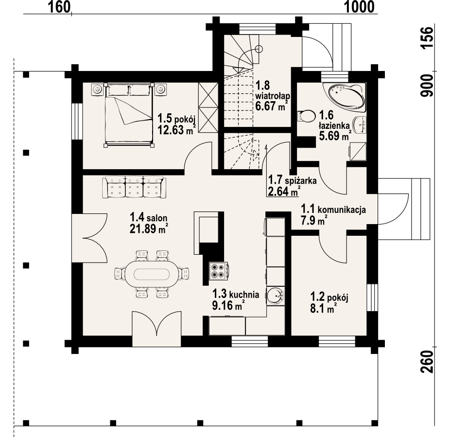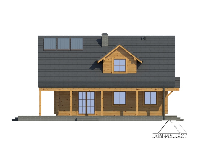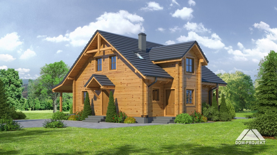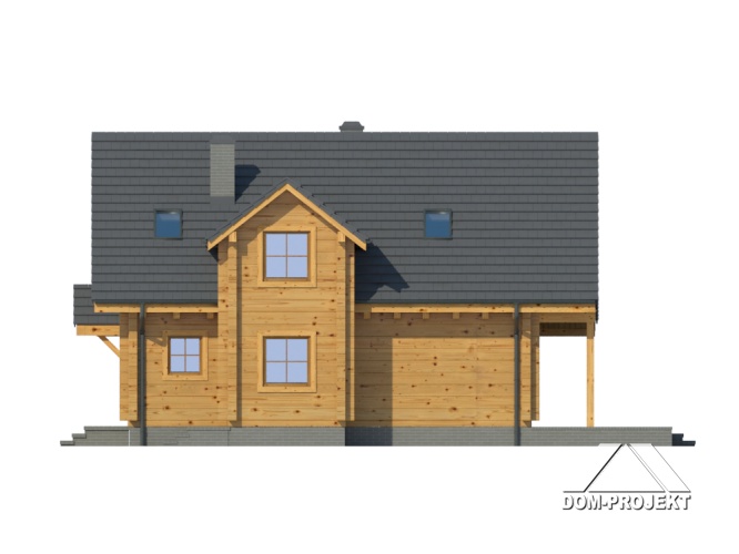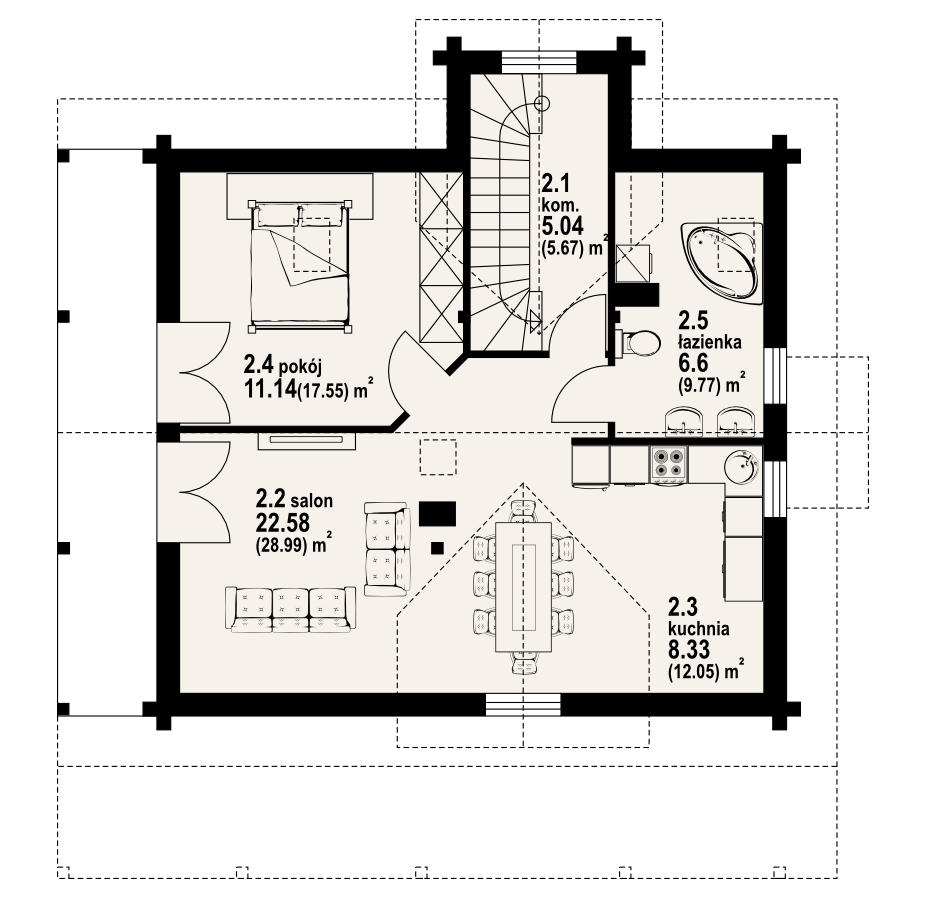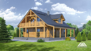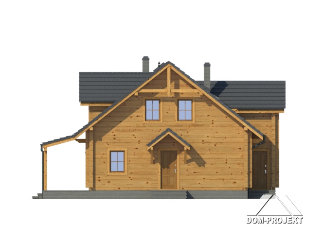 Dom z poddaszem. Duży salon z aneksem kuchennym i wyjściem na taras. Pokój, spiżarnia, wiatrołap i komunikacja. Garaż na dwa samochody, kotłownia. Na poddaszu cztery pokoje, dwie łazienki garderoba i komunikacja. Balkon.
