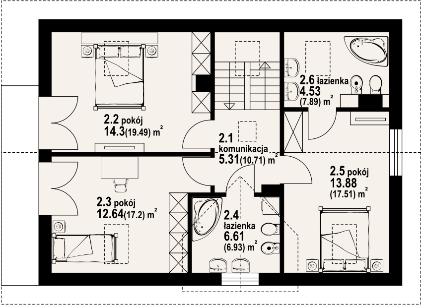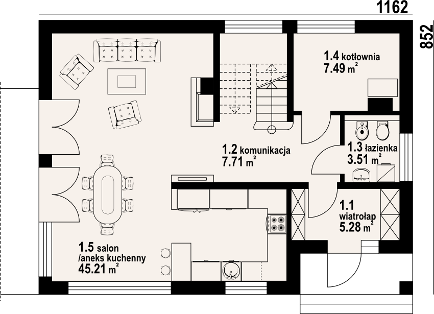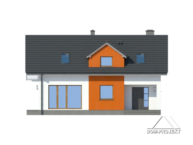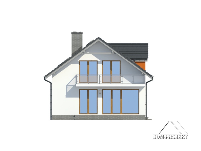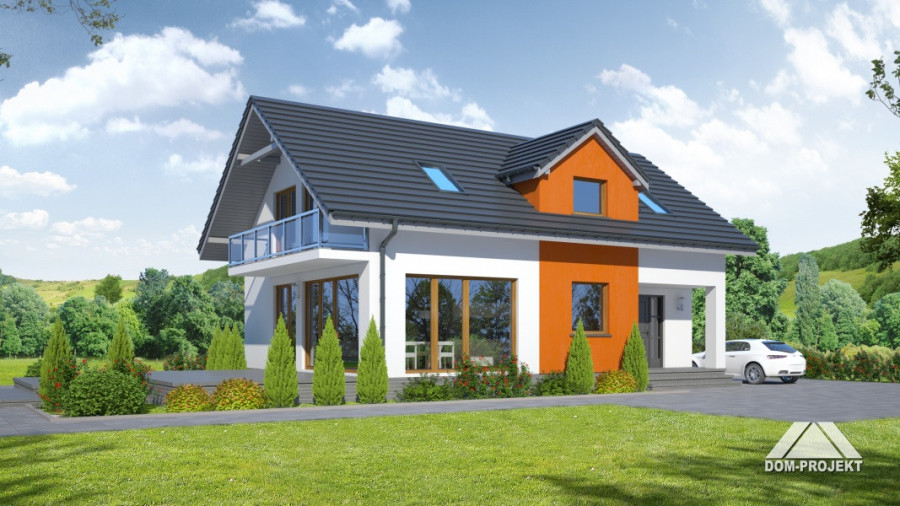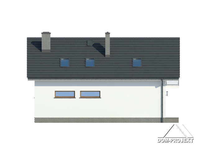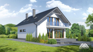 Wygodny dom z poddaszem, w którym na parterze zaprojektowano otwartą część dzienną która stanowi duży, słoneczny salon połączony z aneksem kuchennym. Ponadto na tej kondygnacji znajdują się pomieszczenia łazienki i kotłowni. W strefie nocnej na poddaszu przewidziano trzy sypialnie i dwie łazienki.