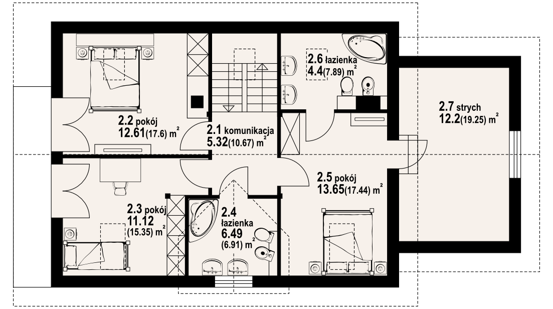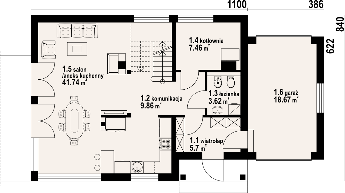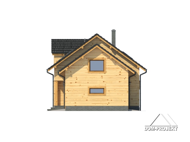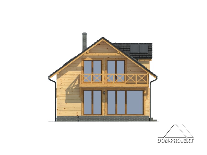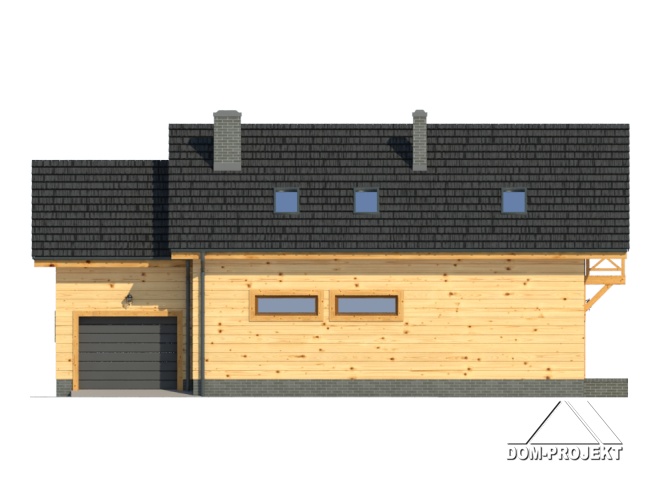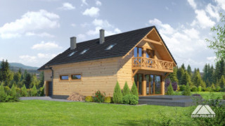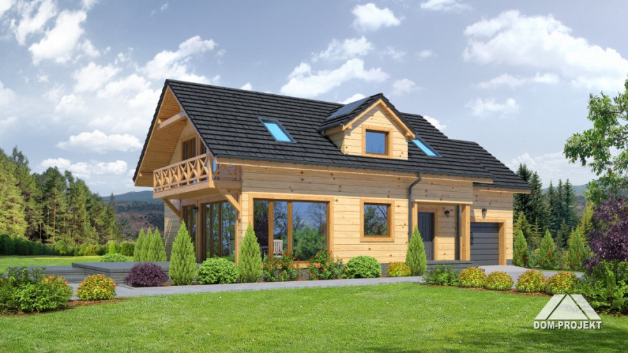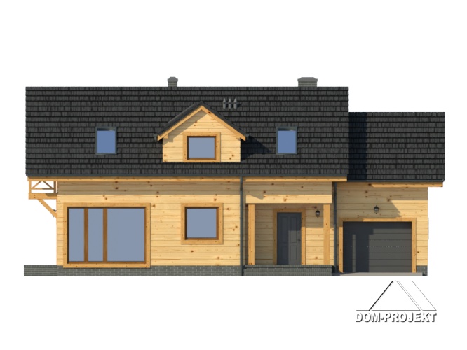 Dom w technologii szkieletowej. Na parterze duży salon z aneksem kuchennym, kominkiem i wyjściem na taras, łazienka, wiatrołap, komunikacja i kotłownia. Na poddaszu trzy pokoje, jeden z własną łazienką, dodatkowa łazienka oraz strych. W bocznej części garaż.