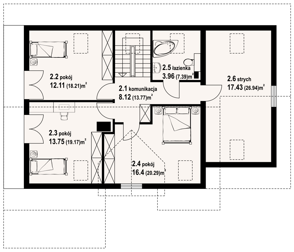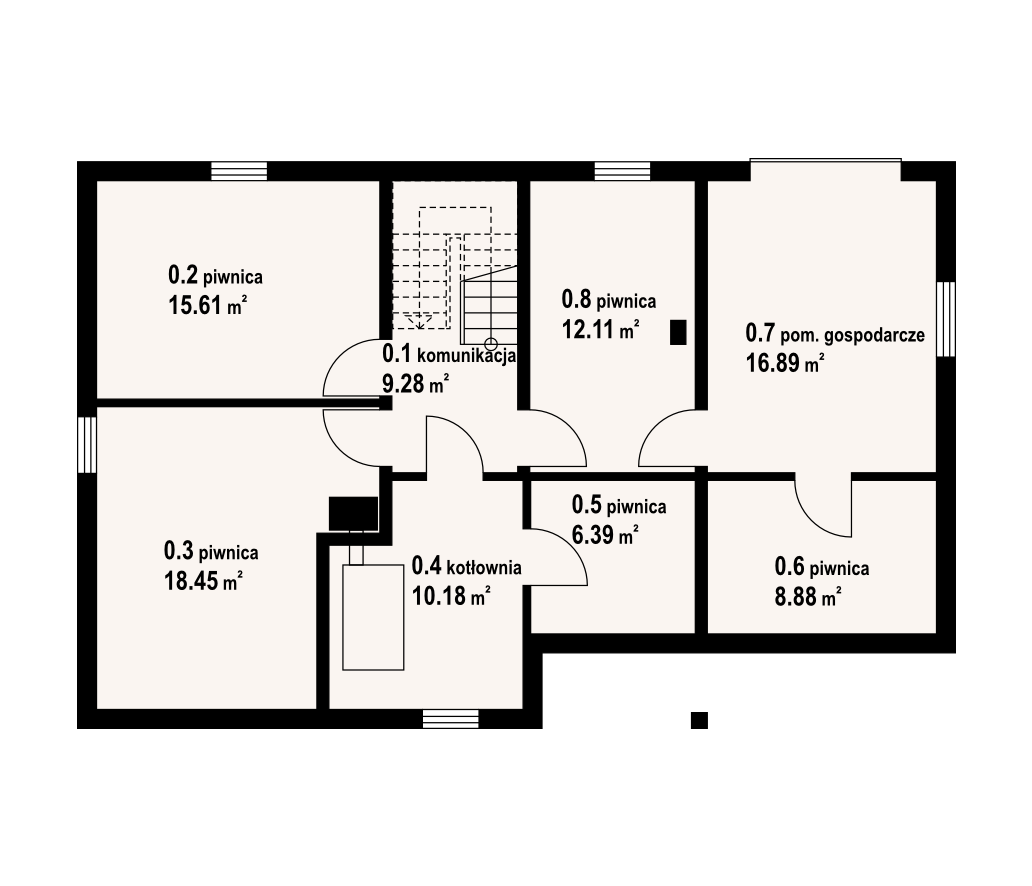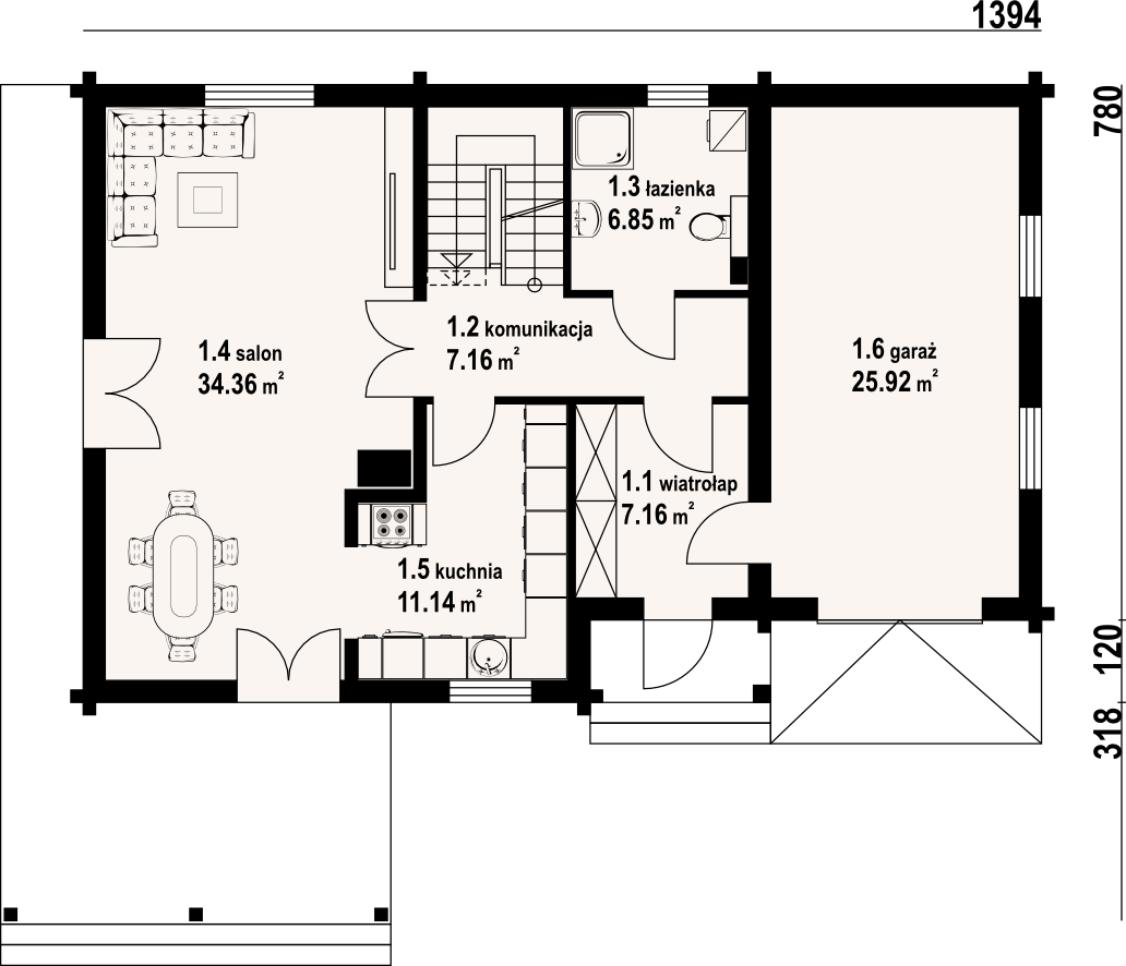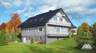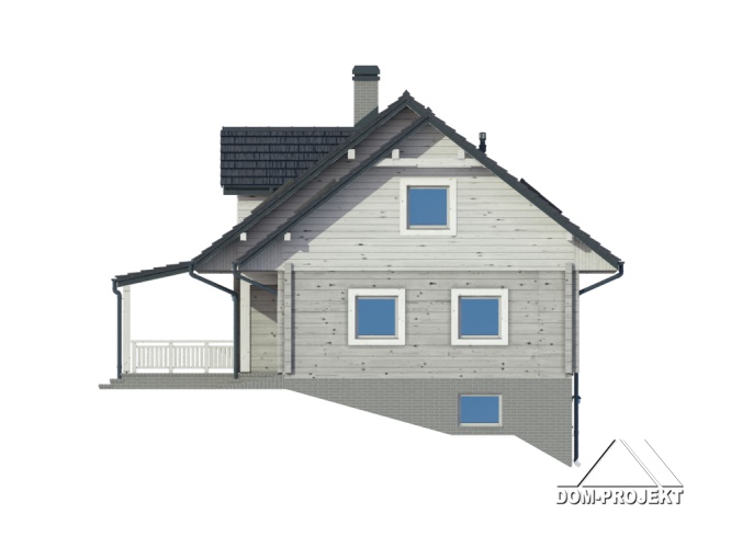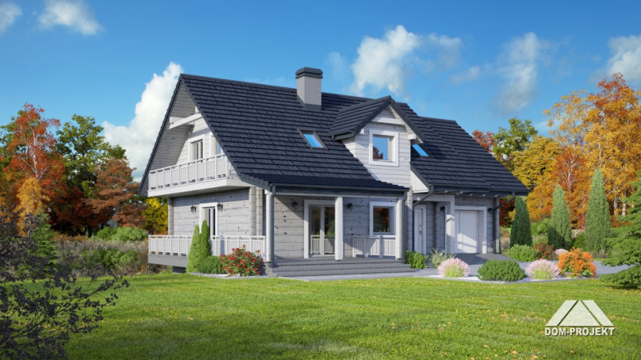 Dom z bali drewnianych. Duży salon a aneksem kuchennym, kominkiem i wyjściem na taras. Łazienka, wiatrołap, komunikacja i garaż. Na poddaszu trzy pokoje, łazienka, strych i balkon. W piwnicach kotłownia, pomieszczenie gospodarcze, pomieszczenia piwnic i komunikacja. Zwarta bryła budynku i dach dwuspadowy sprzyjają taniej i szybkiej budowie i niskim kosztom eksploatacji.