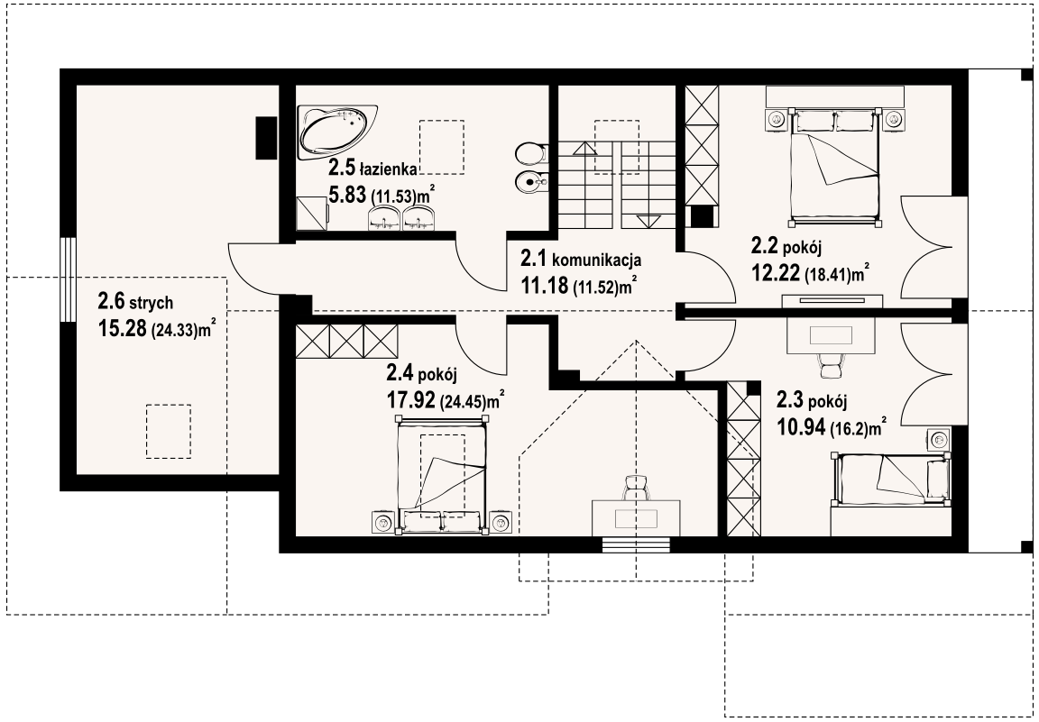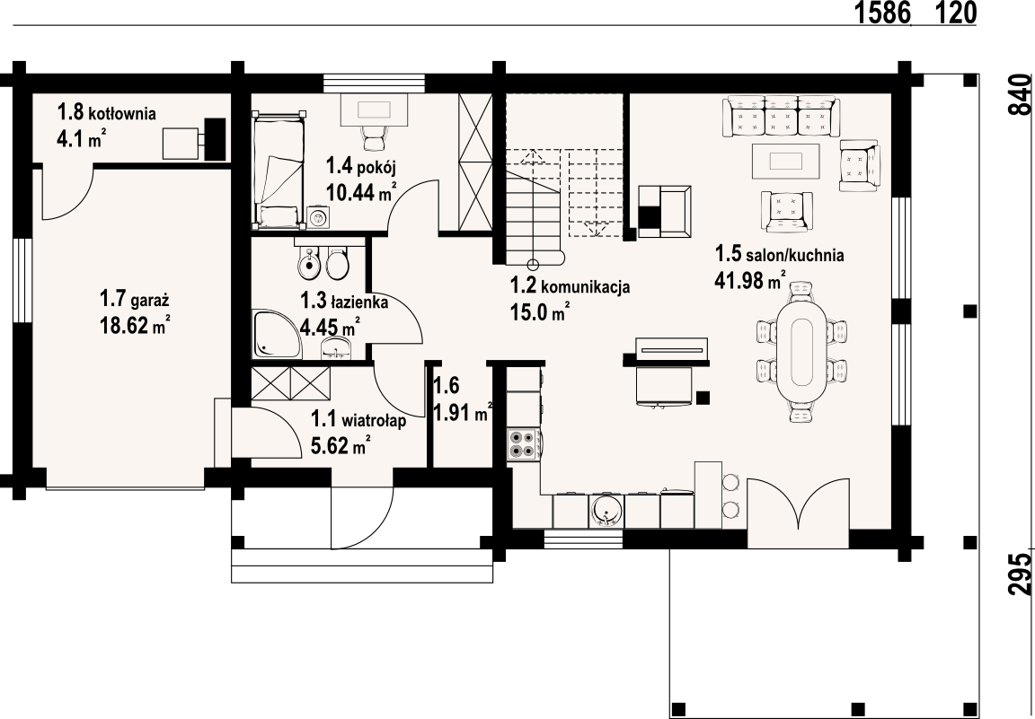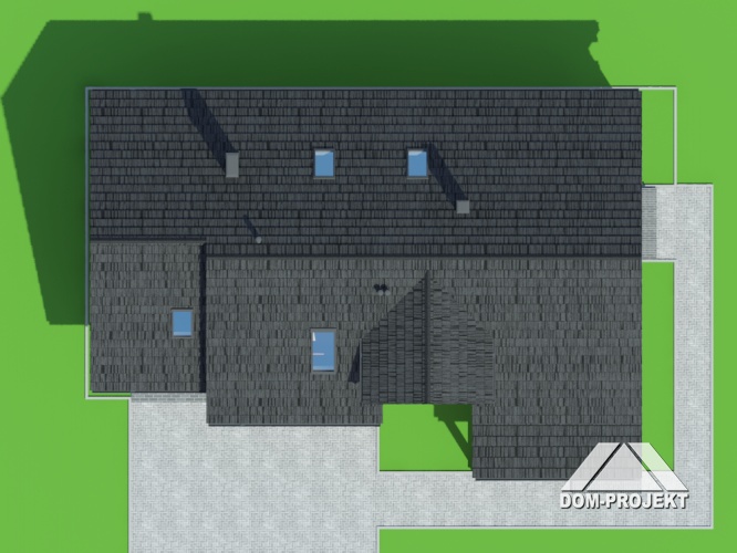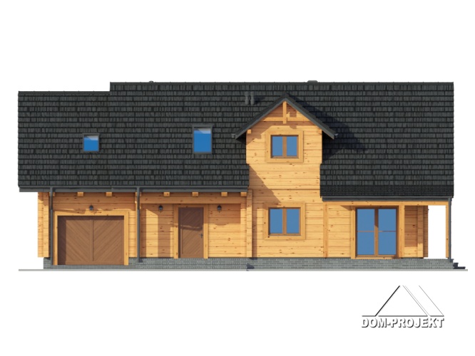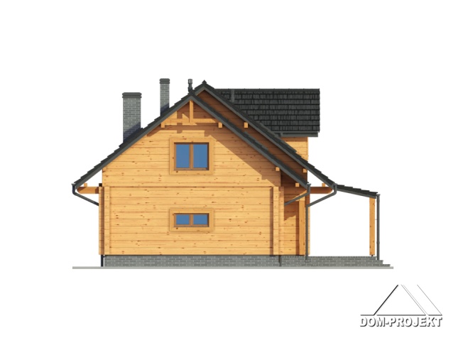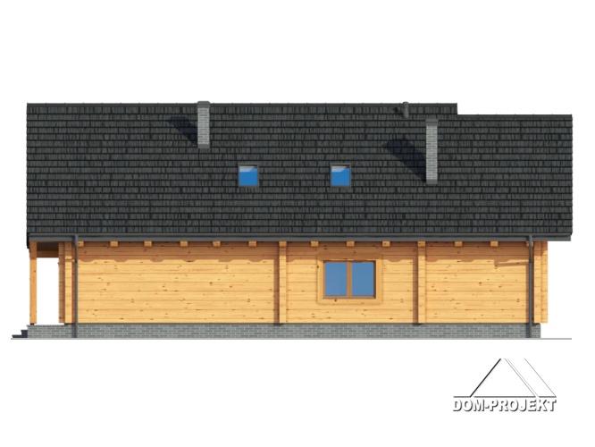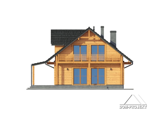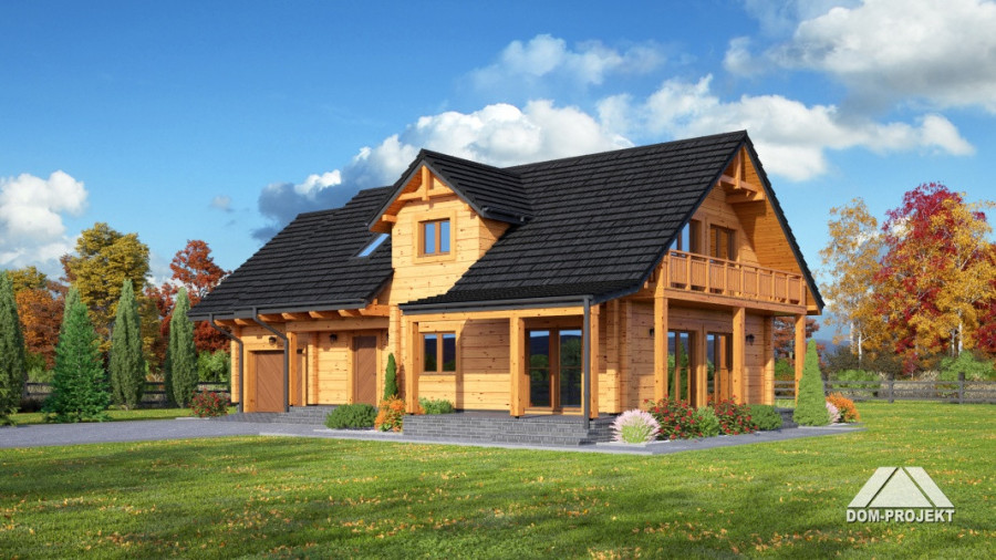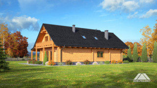 Dom z bali drewnianych. Duży salon z aneksem kuchennym, kominkiem, wyjściem na zadaszony taras i schodami na poddasze. Pokój, łazienka, wiatrołap, spiżarka, garaż i kotłownia. Na poddaszu trzy pokoje, łazienka, strych, komunikacja i balkon. Zwarta bryła budynku i dach dwuspadowy sprzyjają szybkiej i taniej budowie i niskim kosztom eksploatacji.