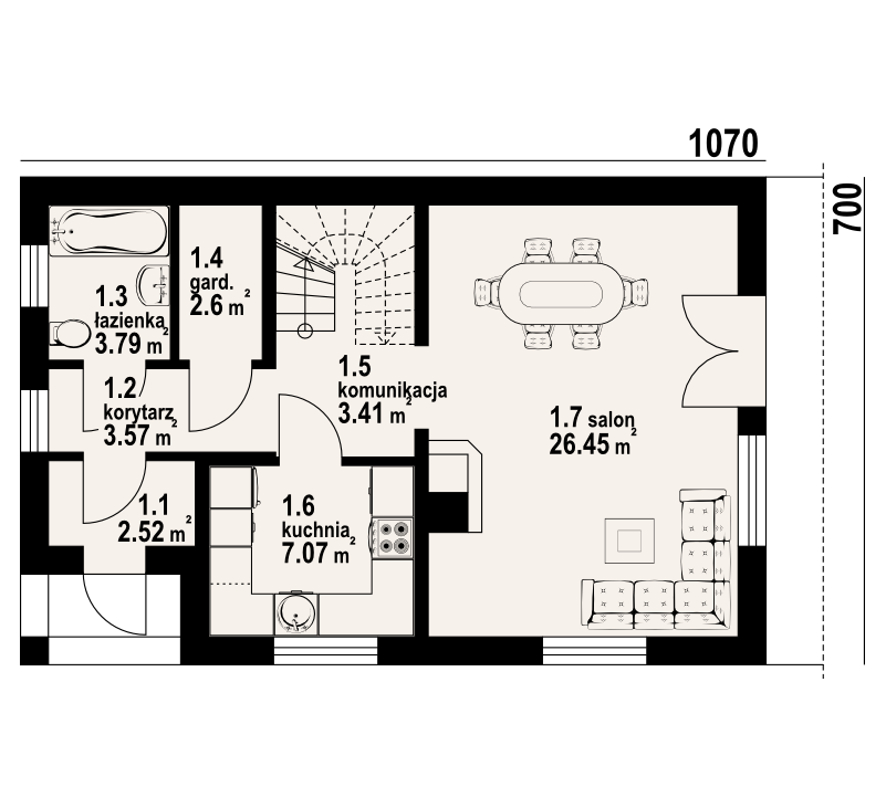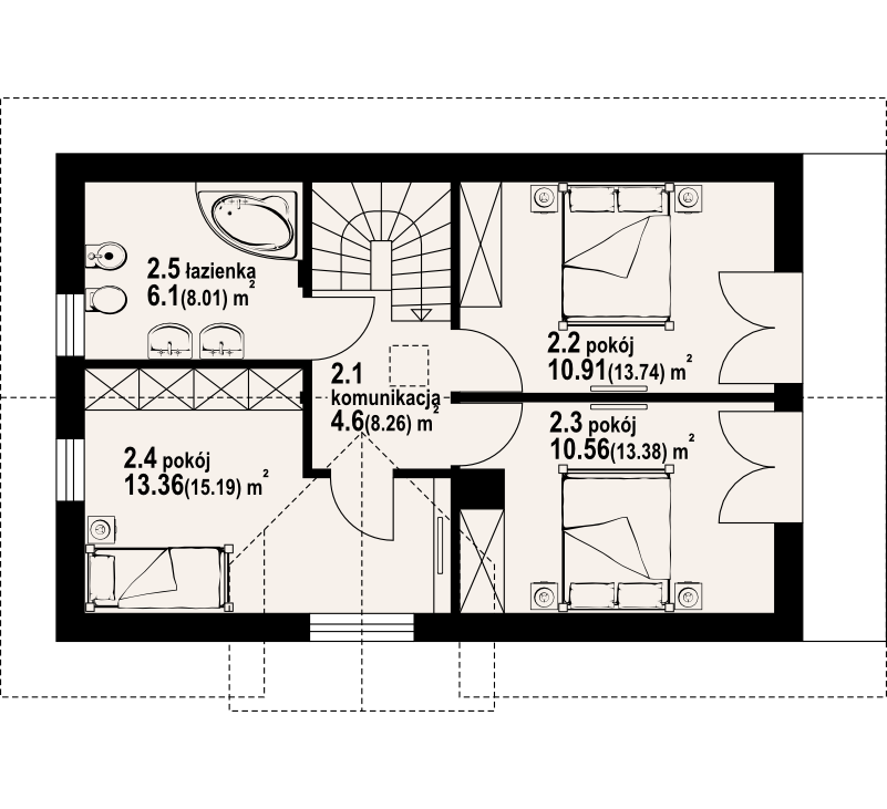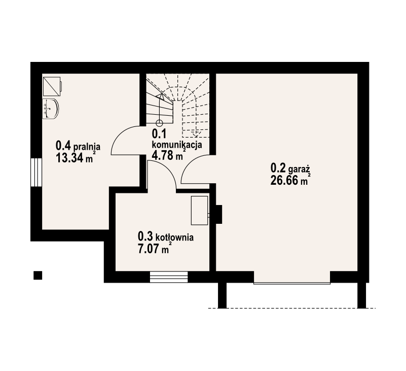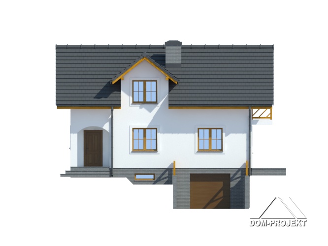 Podpiwniczony dom z poddaszem użytkowym, może być wybudowany na wąskiej działce. Na parterze część dzienna, duży salon, kuchnia, łazienka i garderoba. Na poddaszu trzy pokoje, w tym dwa z wyjściem na balkon oraz łazienka. W podpiwniczeniu zlokalizowano garaż, kotłownię oraz pralnię.