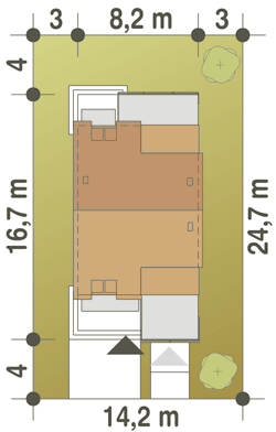 Dom z poddaszem użytkowym i podpiwniczeniem. Na parterze duży salon i duża kuchnia. W salonie kominek i wyjście na taras. Łazienka, wiatrołap i komunikacja. Na poddaszu trzy pokoje, łazienka i komunikacja. Dwa pokoje mają balkon. W piwnicach garaż, kotłownia, pralnia, piwnica i komunikacja. Zwarta bryła budynku i dach dwuspadowy sprzyjają szybkiej i taniej budowie i niskim kosztom eksploatacji.