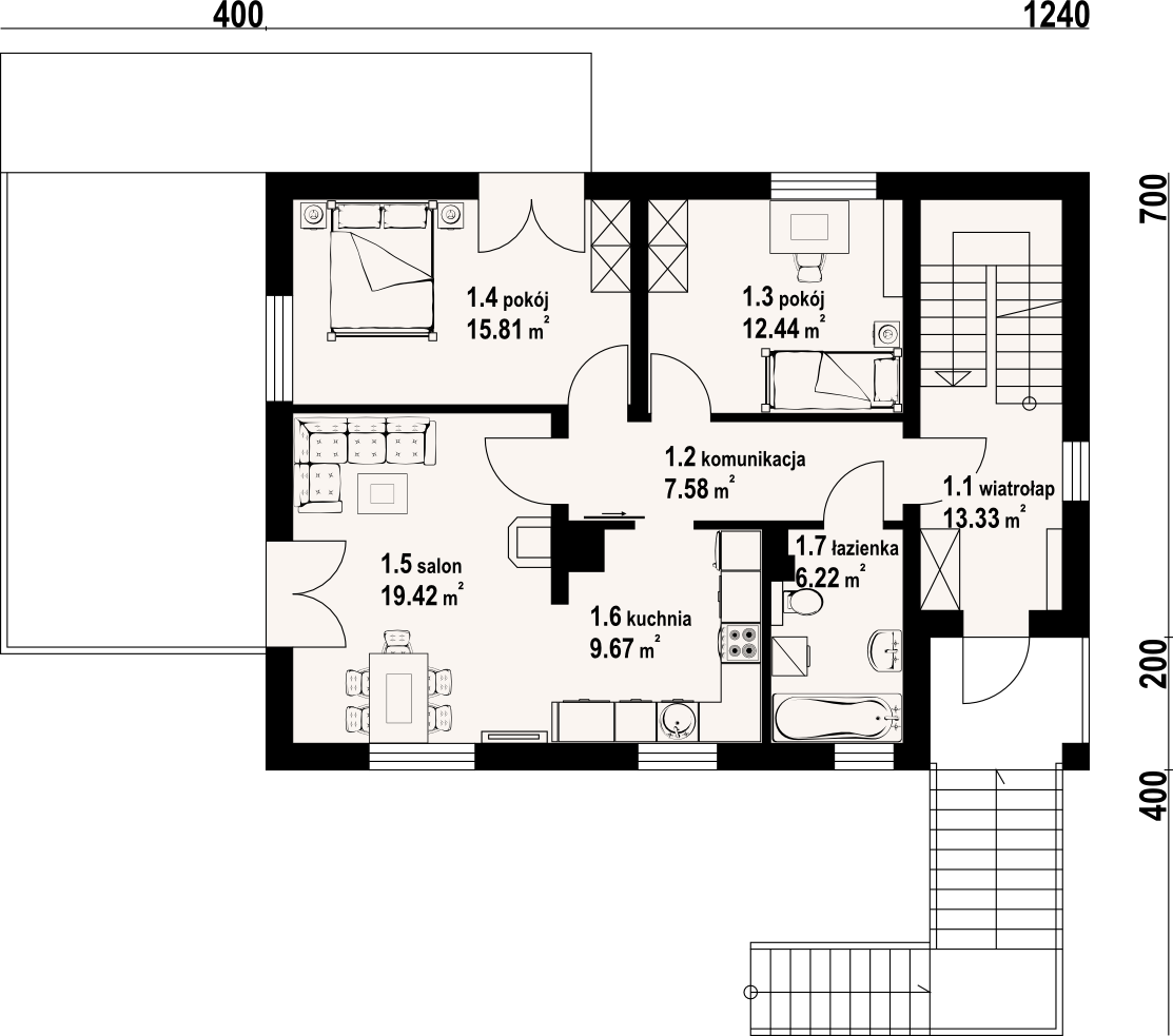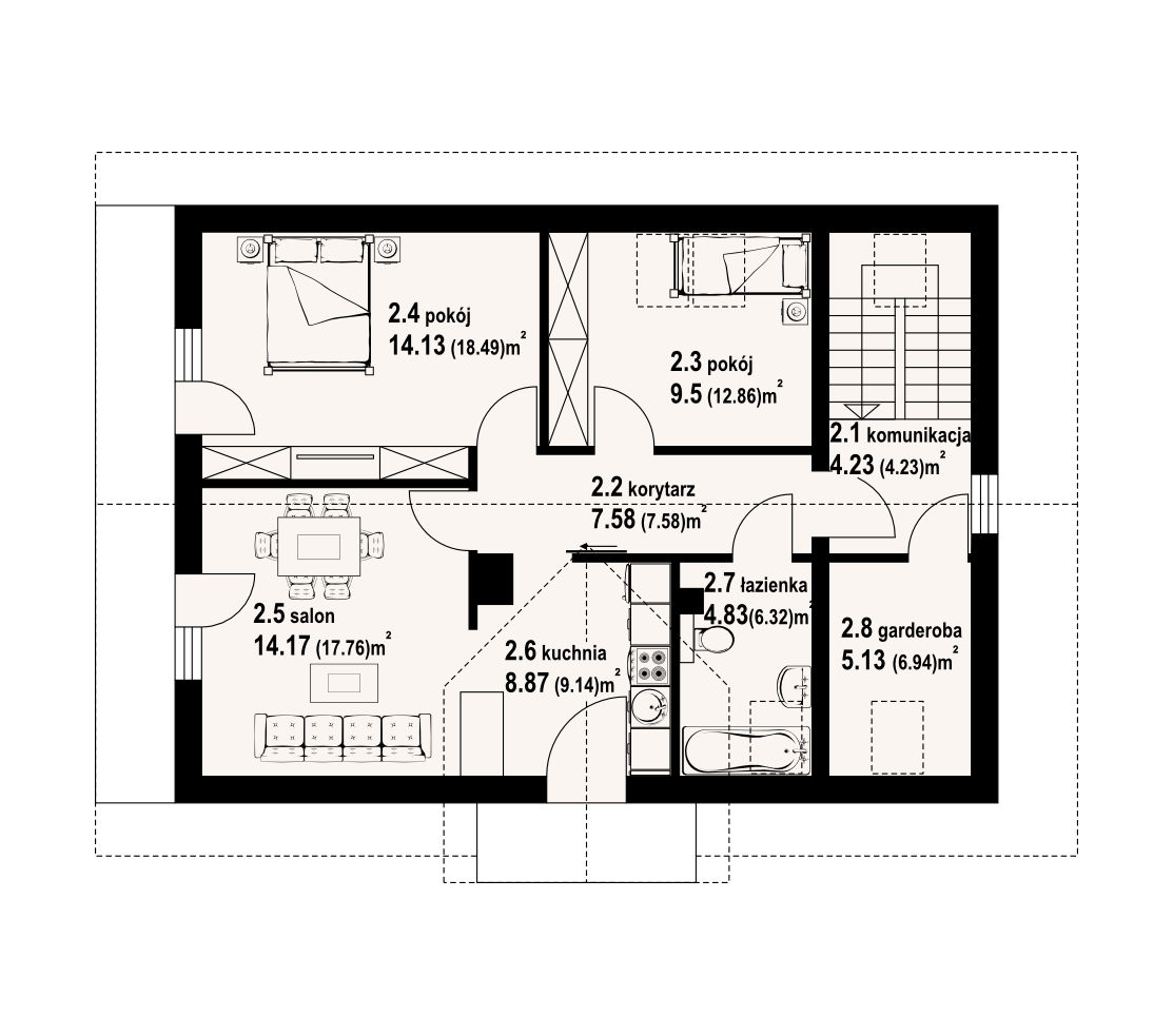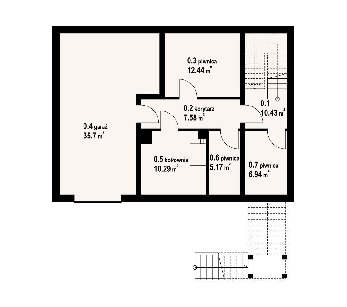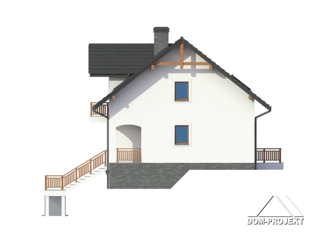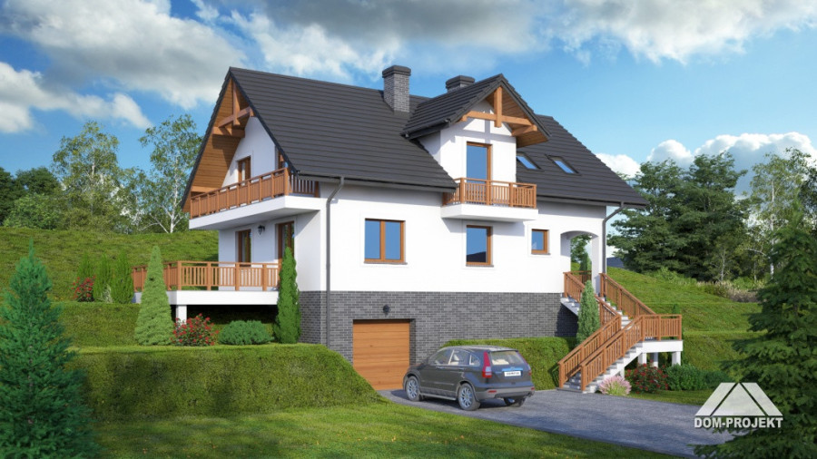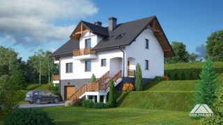 Dom z podpiwniczeniem. Na parterze salon z kominkiem,wyjściem na duży taras i przejściem do dużej kuchni. Dwa pokoje, łazienka, wiatrołap i schody na poddasze i do piwnicy. Na poddaszu salon, kuchnia, dwa pokoje, łazienka, garderoba, dwa balkony. W piwnicach garaż, kotłownia, piwnice i komunikacja. Zwarta bryła budynku i dach dwuspadowy sprzyjają szybkiej i taniej budowie i niskim kosztom eksploatacji.
