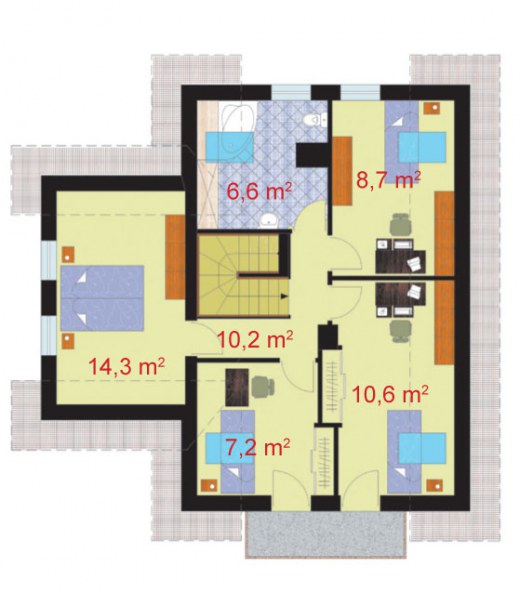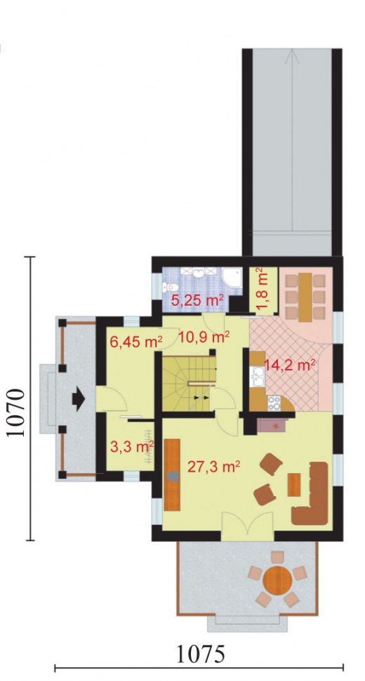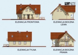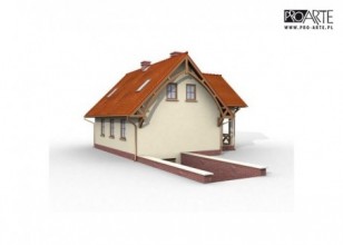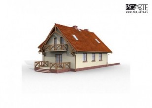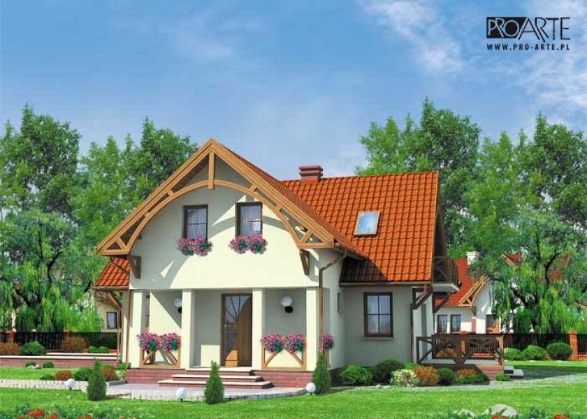 To dom okazały, elegancki wyróżniający się doskonałymi proporcjami i ładną bryłą, której uroku dodaje wysoki, spadzisty dach. Efektowny front budynku to zasługa nadwieszonej części poddasza, wspartej na czterech prostych filarach dzięki temu powstała zgrabna, ozdobiona drewnianymi balustradami werandka. Boczną elewację ogrodową uatrakcyjnia spory taras i niewielki balkon. Dom jest podpiwniczony (w podziemiu mieści się garaż i kotłownia). Największym pomieszczeniem na parterze jest pokój dzienny, z którego wychodzi się na taras, który od wiosny do jesieni może być traktowany jak przedłużenie salonu idealne miejsce na popołudniowe party . Funkcjonalnie zaprojektowana kuchnia ma jasny aneksem ja