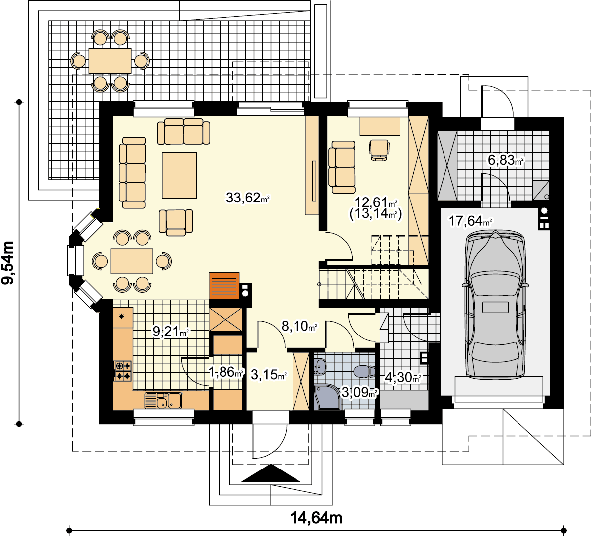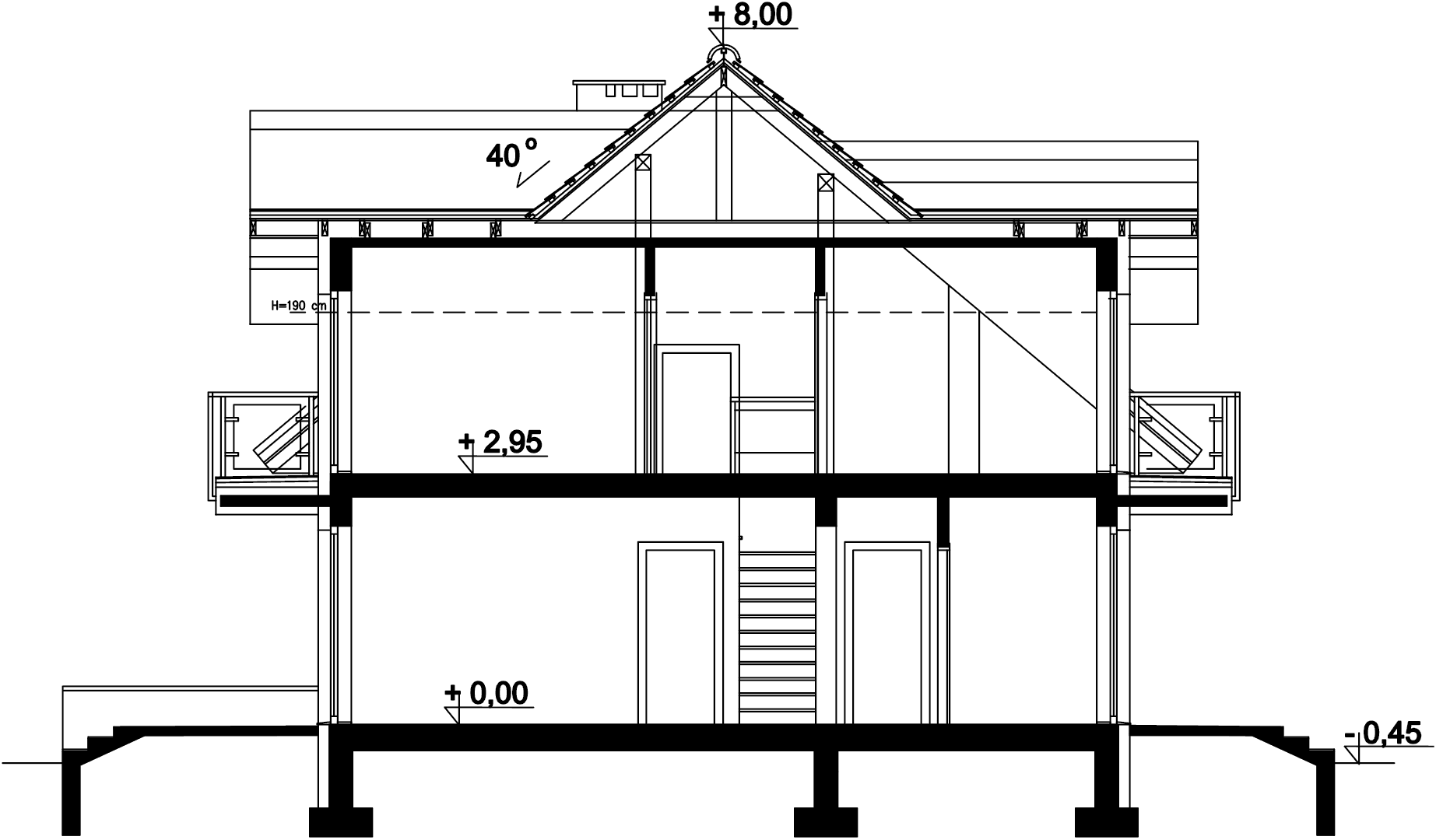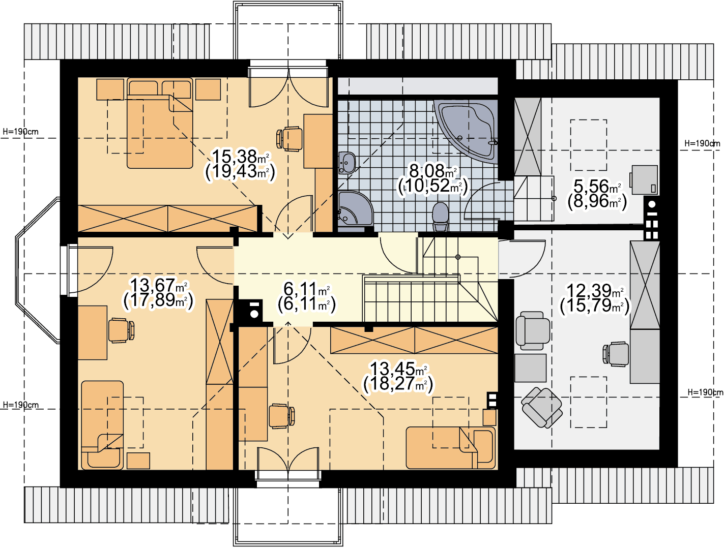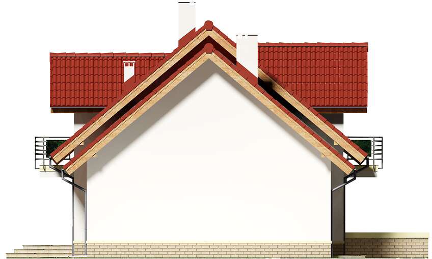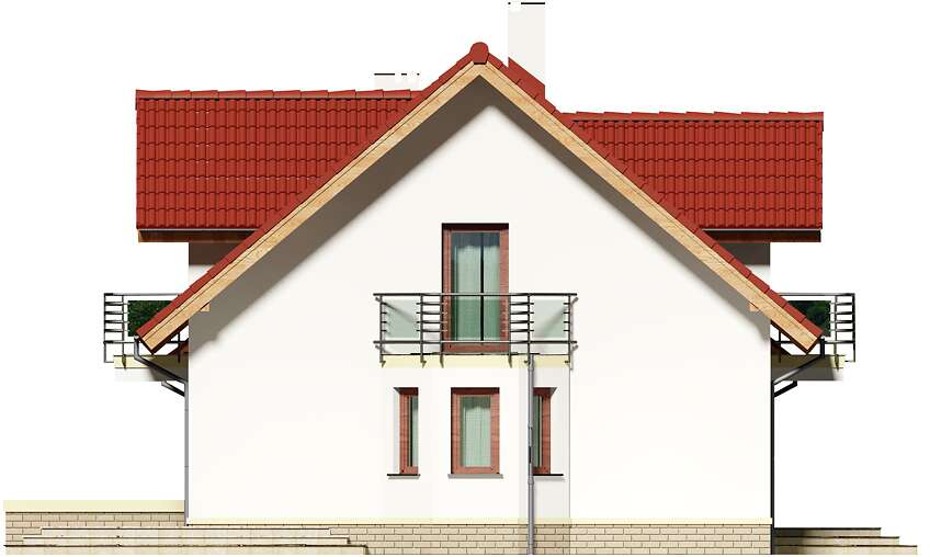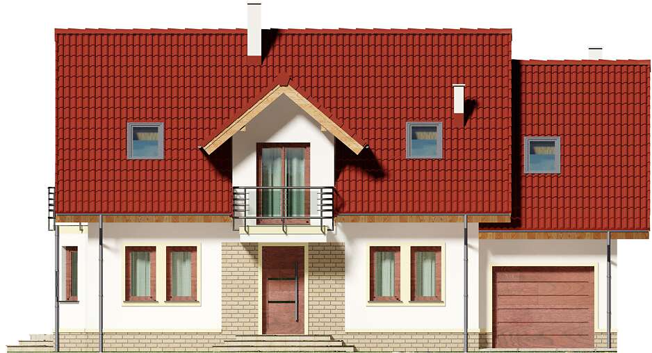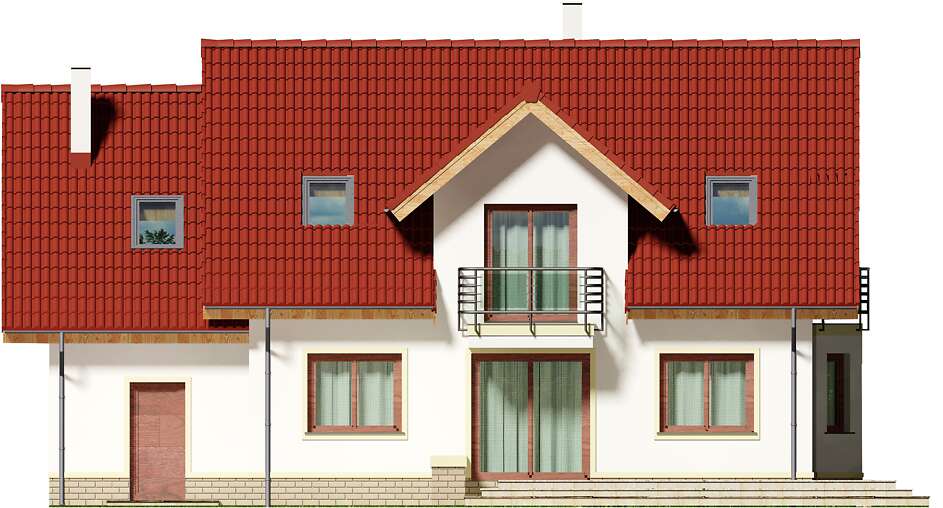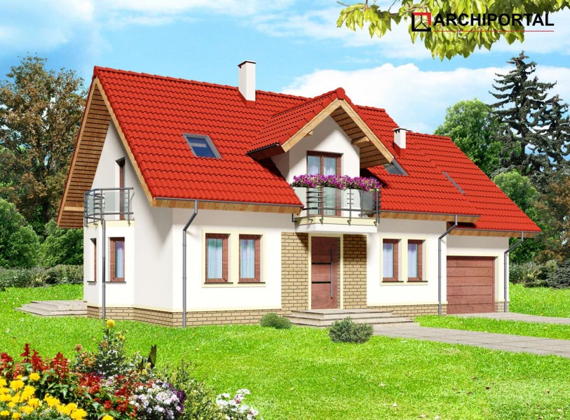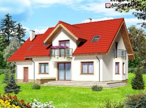 Projekt klasycznego domu z dwuspadowym dachem, w którym wygonie zamieszka 4-5 osobowa rodzina. Do dyspozycji mieszkańców jest duża otwarta kuchnia (w razie potrzeby można ją zamknąć ścianką działową). Nie zapomniano w niej o miejscu pod zabudowę sprzętem AGD i praktycznej spiżarni. Duży, przestronny salon z ciekawym wykuszem jadalnym jest doskonałym miejscem wypoczynku w ciągu dnia, a centralne położenie kominka nadaje całości przytulnego charakteru i doskonale sprawdzi się podczas ogrzewania domu w zimie. Bezpośrednio z pokojem dziennym sąsiaduje dodatkowy pokój, który może pełnić funkcję gabinetu lub pokoju gościnnego. Do garażu dostajemy się przez praktyczne pomieszczenie gospodarcze, w pobliżu którego znalazła się niewielka łazienka. Za garażem znajduje się kotłownia, z bezpośrednim wyjściem na ogród. Jej duża powierzchnia pozwala rozważać inny sposób ogrzewania niż gazowe. Poddasze to typowa strefa nocna. Znajdują się tu 3 ustawne pokoje oraz duża łazienka. Prawdziwą zaletą jest jednak pomieszczenie znajdujące się nad garażem. Zostało ono podzielone na dwie części. Do jednej dostajemy się wprost z łazienki i można z niego zrobić pralnię. Drugą część, dostępną z klatki schodowej, można przerobić na gabinet, pokój hobby, lub po prostu dodatkowe pomieszczenie mieszkalne. Pomieszczenia te mogą być też połączone, tworząc jedno duże. Dom ma nieskomplikowaną bryłę i prosty dach, dzięki czemu będzie tani w budowie i późniejszej eksploatacji.