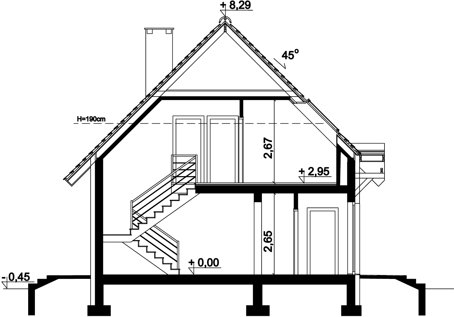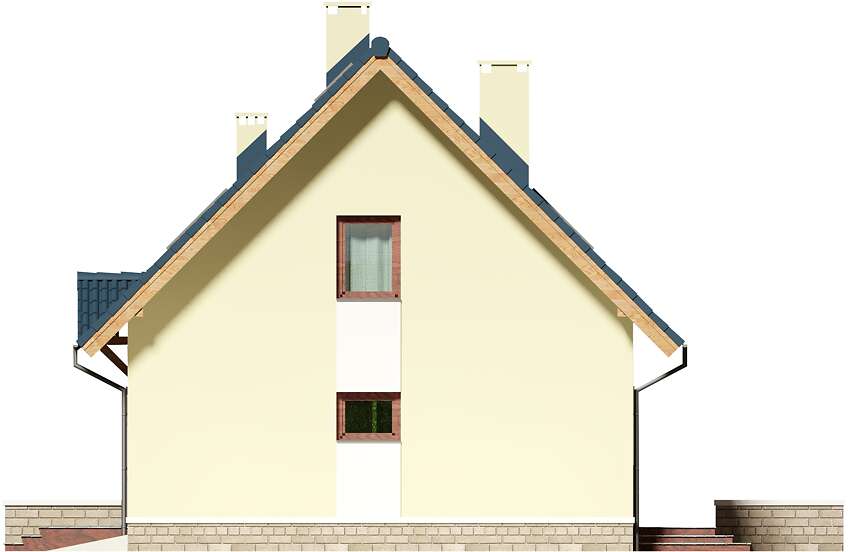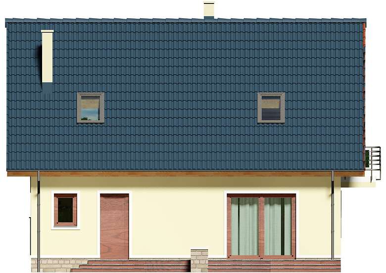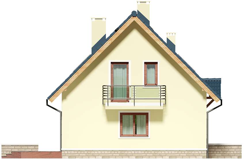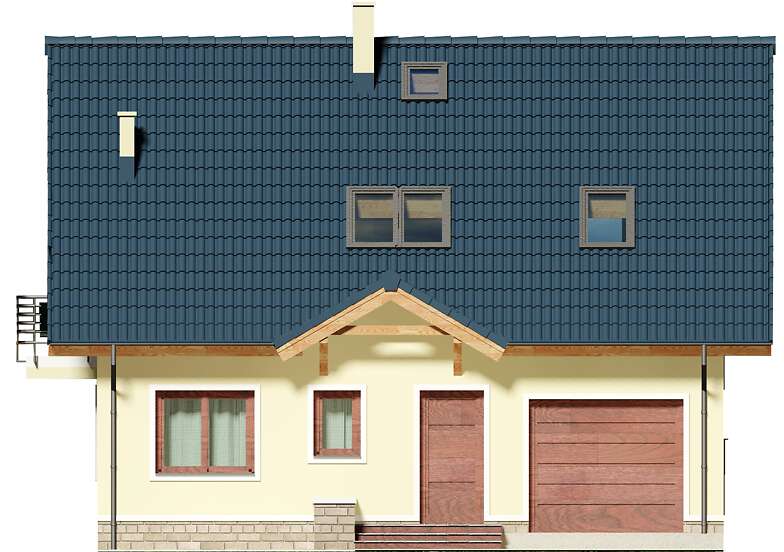Klasyczny domek z wbudowanym garażem. W projekcie zrezygnowano z tradycyjnej klatki schodowej powiększając powierzchnię salonu, co daje poczucie niezwykłej przestrzeni i komfortu. Dodatkową zaletą parteru jest otwarta, nowoczesna kuchnia, pojemna spiżarnia i duże pomieszczenie gospodarcze z bezpośrednim dostępem do ogrodu. W domu zaprojektowano ogrzewanie na paliwo stałe. Z garażu wchodzimy wprost do wiatrołapu, w którym nie zapomniano o miejscu na praktyczną szafę przesuwną. Centralne położenie kominka doskonale sprawdza się podczas ogrzewania tego niewielkiego domku w długie, zimowe wieczory. Na piętrze znajdują się trzy ustawne pokoje, oraz duża łazienka z miejscem na wannę i prysznic. Dodatkowo, sypialnia rodziców ma własny balkon i połączona jest z dużą i jasną garderobą. Dzięki zaprojektowaniu schodów składanych w korytarzu mamy dostęp do stryszku nad piętrem. Dom ma nieskomplikowaną bryłę i prosty dach, dzięki czemu jest tani w budowie i późniejszej eksploatacji.
