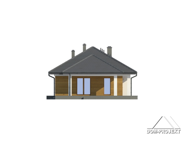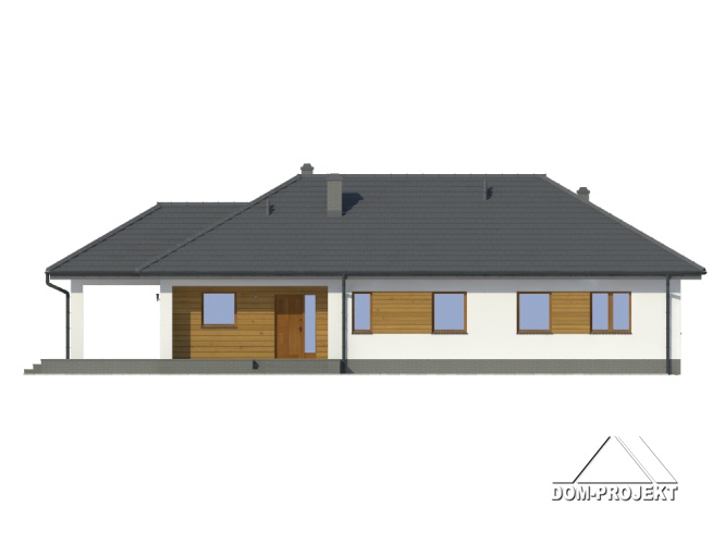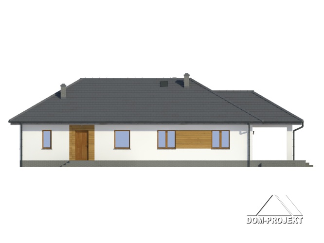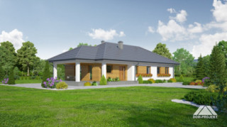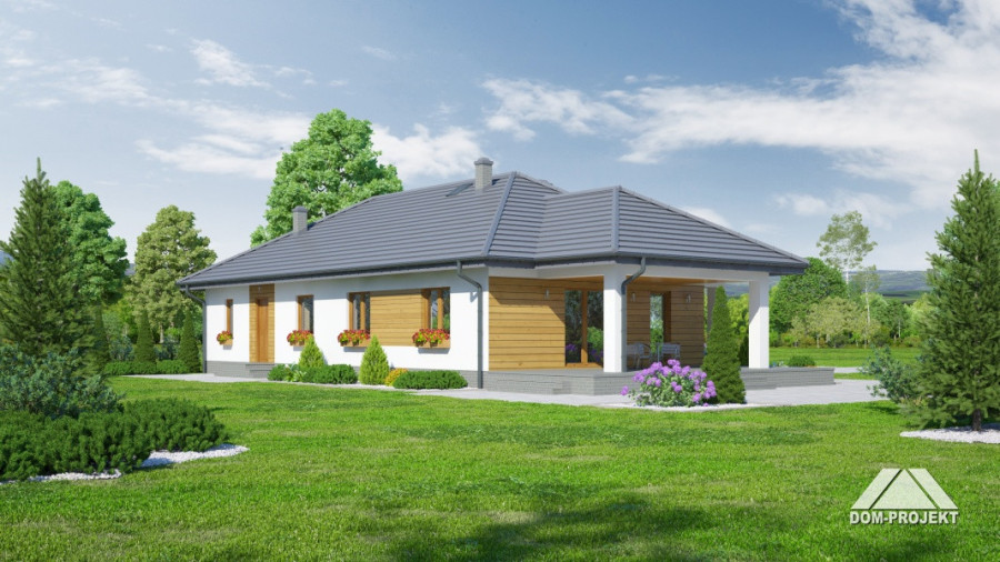 Dom parterowy z wydzielonym mieszkaniem dla seniora. Mieszkanie główne: duży salon z aneksem kuchennym, kominkiem i wyjściem na zadaszony taras. Trzy pokoje, łazienka, wiatrołap i korytarz. W mieszkaniu dla seniora: salon z aneksem kuchennym, pokój, łazienka i korytarz. Dostęp do strychu schodami rozkładanymi. Na strychu możliwość składania starych mebli itp.