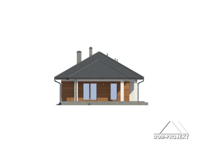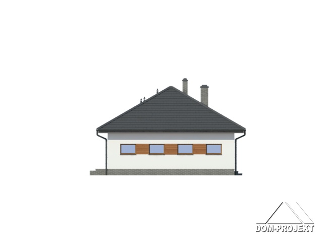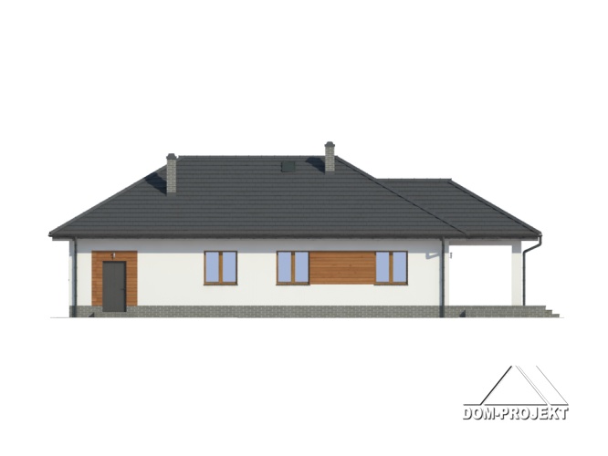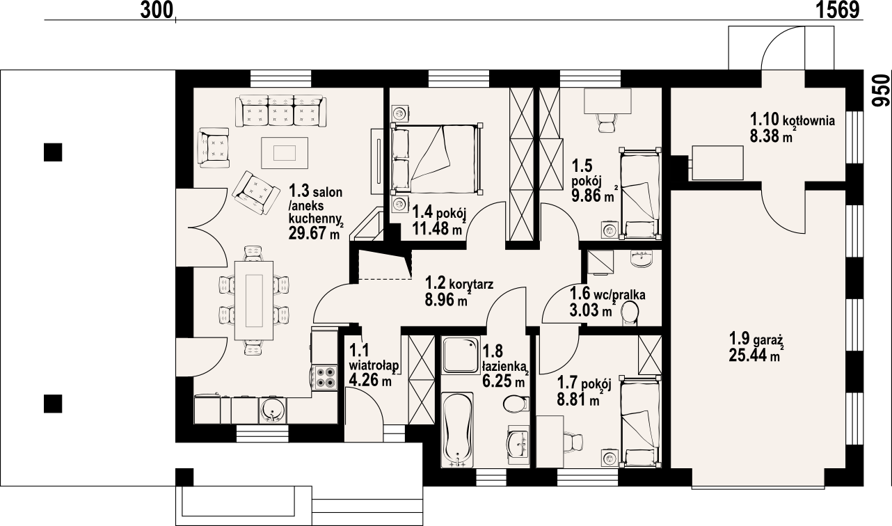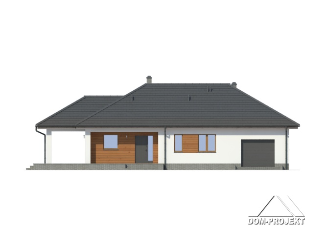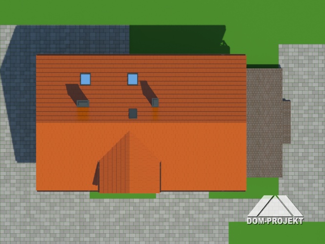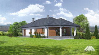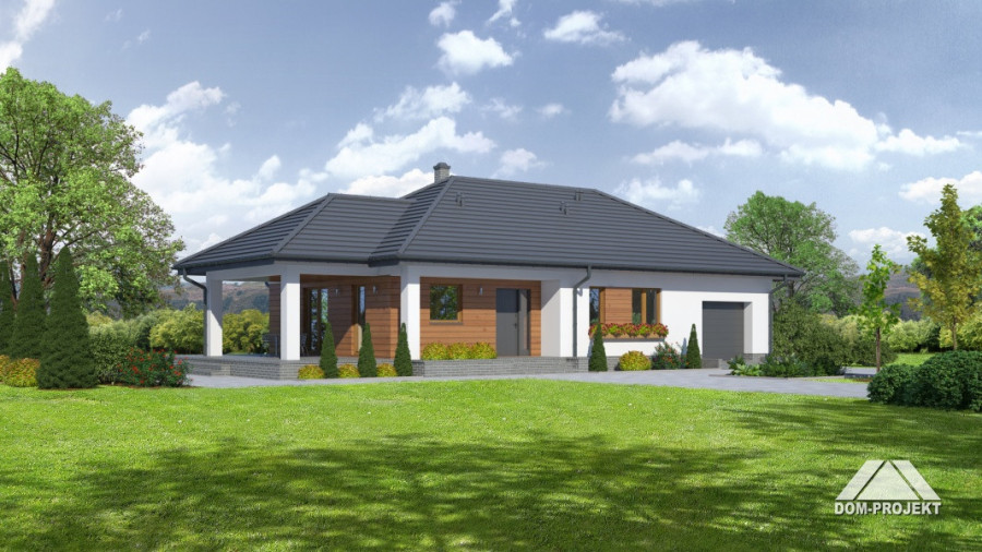 Dom parterowy. Duży salon z aneksem kuchennym, kominkiem i wyjściem na zadaszony taras. Trzy pokoje, łazienka, wc z pralką, wiatrołap i korytarz. Garaż, kotłownia. Wyjście na poddasze schodami rozkładanymi. Na poddaszu strych.