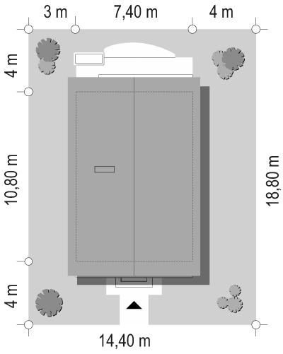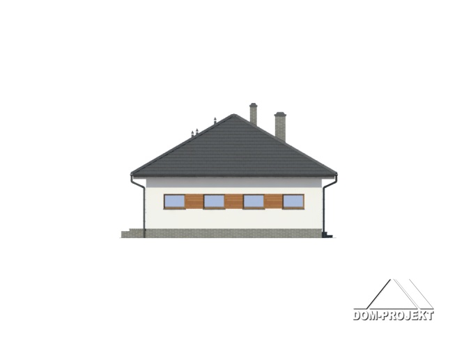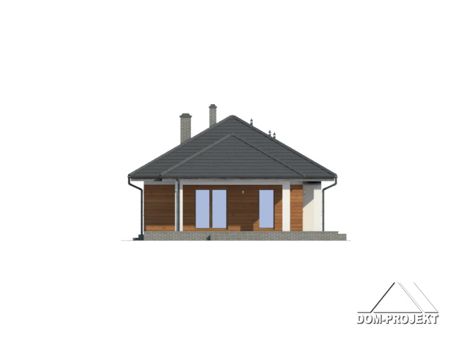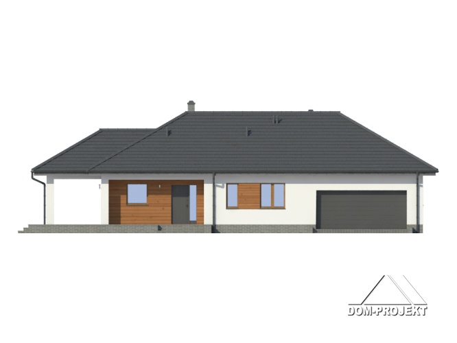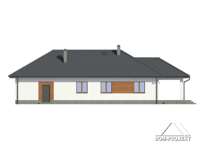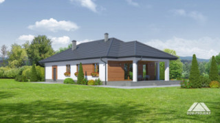 Dom parterowy. Duży salon z aneksem kuchennym, kominkiem i wyjściem na zadaszony taras. Trzy pokoje, łazienka, wc z pralką, wiatrołap i korytarz. Garaż dwustanowiskowy, kotłownia. Wyjście na poddasze schodami rozkładanymi. Na poddaszu strych.