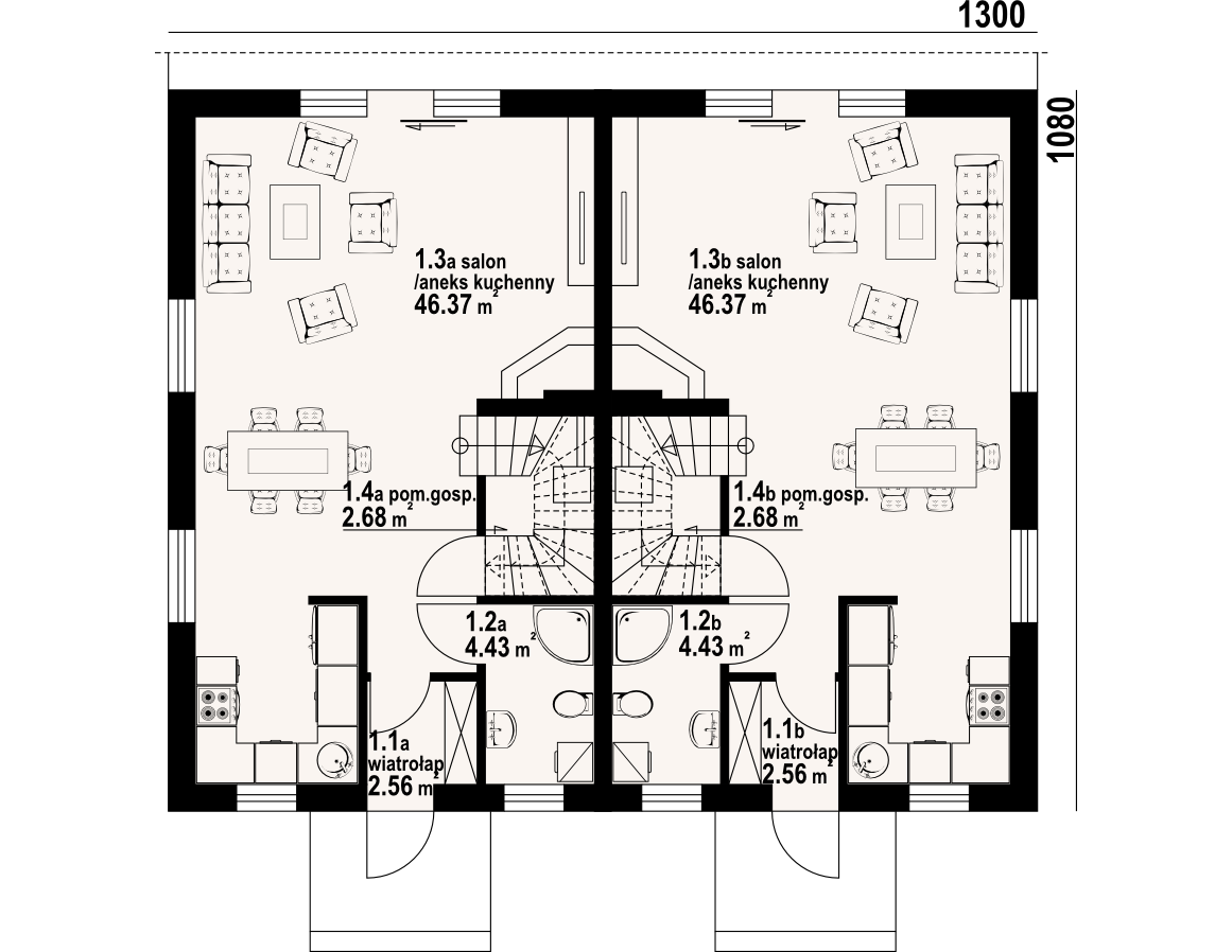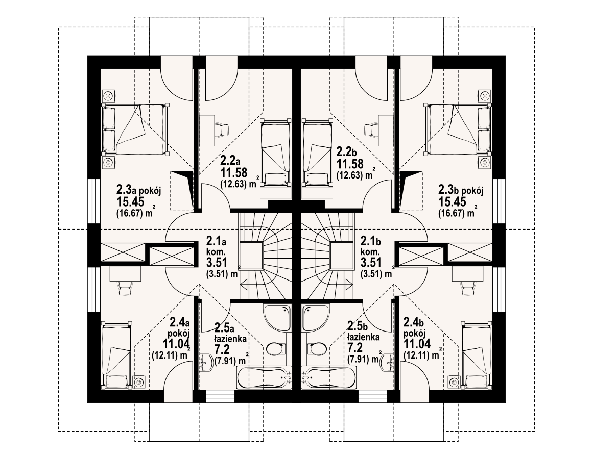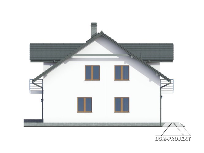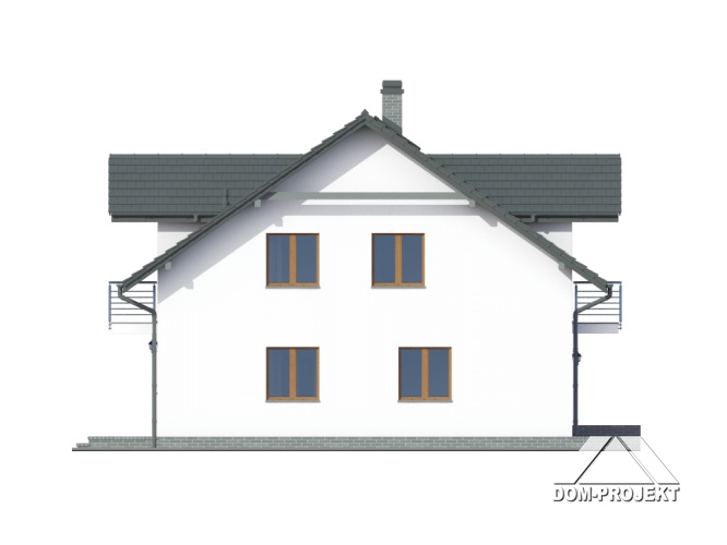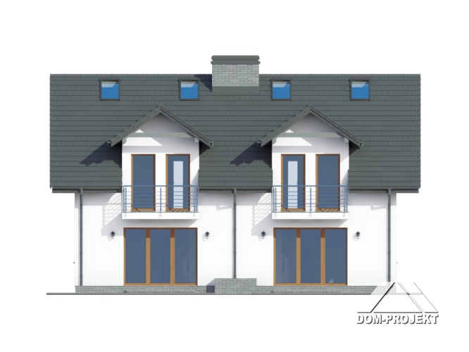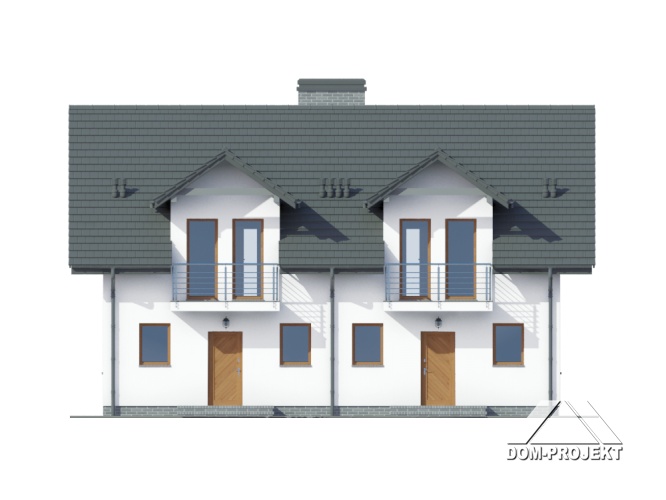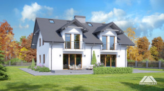 Dom z dwoma mieszkaniami. W każdym mieszkaniu: na parterze duży salon z aneksem kuchennym, kominkiem i wyjściem na taras. Łazienka, wiatrołap, pomieszczenie gospodarcze i schody na poddasze. Na poddaszu trzy pokoje, łazienka, komunikacja i dwa balkony. Zwarta bryła budynku i dach dwuspadowy sprzyjają szybkiej i taniej budowie i niskim kosztom eksploatacji.