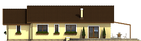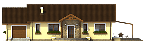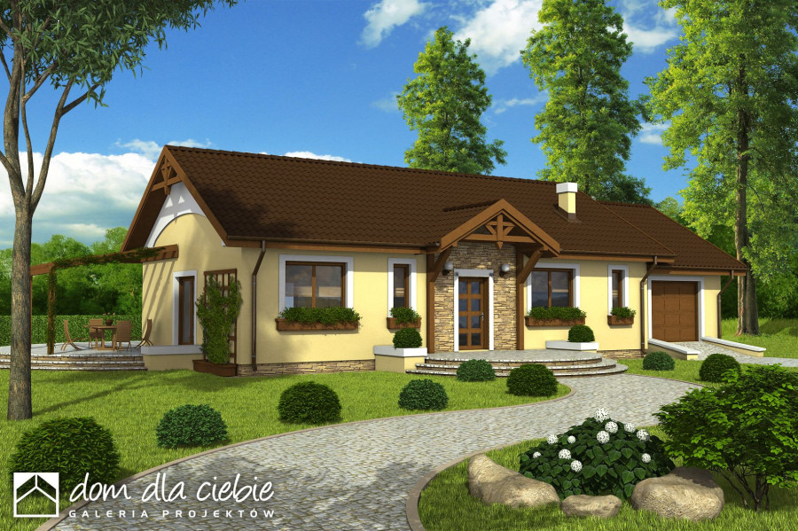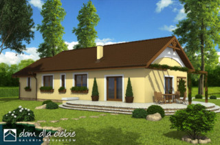 Niewielki dom jednorodzinny parterowy z przybudowanym garażem. Zaprojektowany z myślą o 4 osobowej rodzinie. Nieskomplikowana bryła, pozwoli na znaczne obniżenie kosztów budowy (prostokątny obrys domu oraz dach dwuspadowy). Posiada wyraźny podział na strefę dzienną, w skład której wchodzi kuchnia ze spiżarnią, jadalnia, pokój dzienny i wc, oraz nocną do której zaliczają się trzy pokoje, łazienka i pomieszczenie gospodarcze przez które można przejść do garażu. Polecamy!fundamenty: BETONOWE ściany zewnętrzne: POROTHERM+STYROPIAN TERMO ORGANIKA ściany wewnętrzne: POROTHERM rodzaj stropu: TERIVA elewacje: TYNK STRUKTURALNY, OKŁADZINA KAMIENNA pokrycie dachu: DACHÓWKA CERAMICZNA