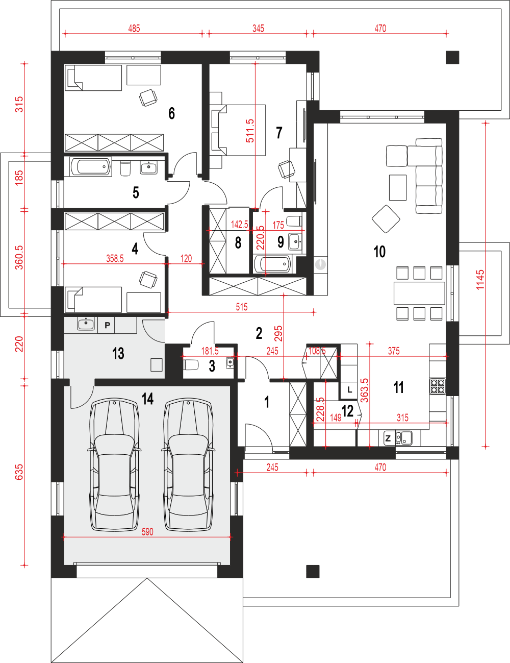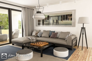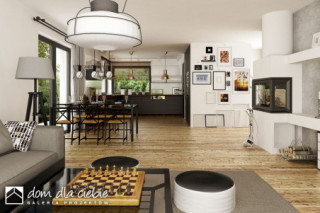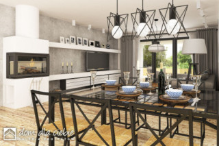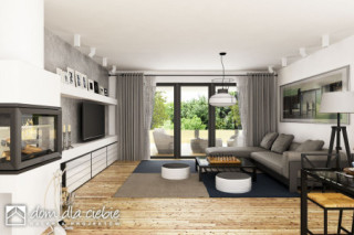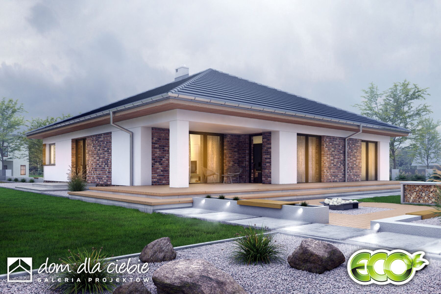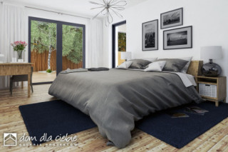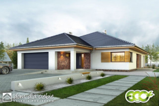Pogodna to propozycja domu dedykowanego 3-4 osobowej rodzinie. Prosta bryła budynku przewidziana na planie kwadratu została przekryta kopertowym dachem o niewielkim kacie nachylenia. Strefa wejściowa do budynku wraz z garażem to spójną całość. Nowoczesna stylistyka elewacji stawia na naturalne barwy i materiały, dominują tu drewno i cegła. Funkcja domu to 3 pokoje sypialne w tym jedna typu masterbedroom z osobną łazienką i garderobą a także wspólna łazienka dla pozostałych mieszkańców. Pogodna kryje w swej bryle również salon z jadalnią i otwartą kuchnią ze spiżarnią. W strefie wejściowej znajdziemy dodatkową garderobę i wc. Ze stanowiącego serce domu salonu dostaniemy się na przestronny, zadaszony taras.fundamenty: BETONOWE ściany zewnętrzne: POROTHERM+STYROPIAN TERMO ORGANIKA rodzaj stropu: TERIVA I elewacje: TYNK STRUKTURALNY pokrycie dachu: DACHÓWKA CEM. lub CER.