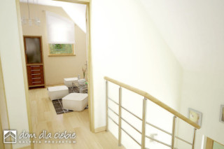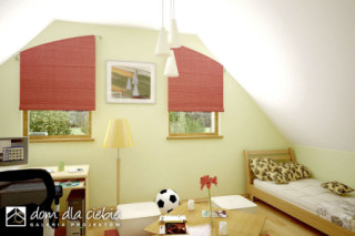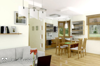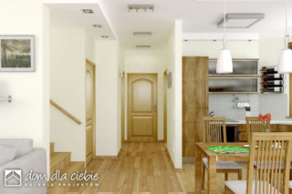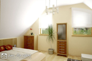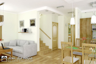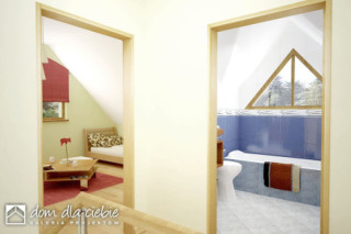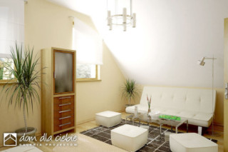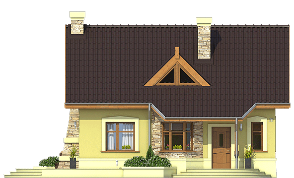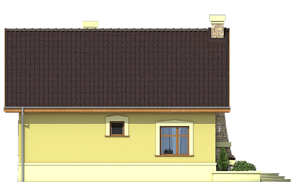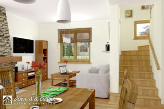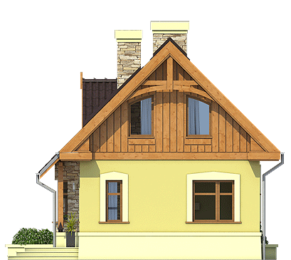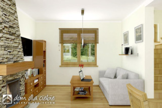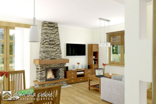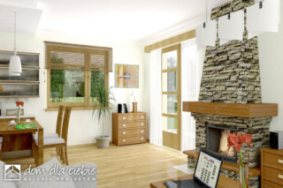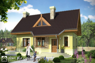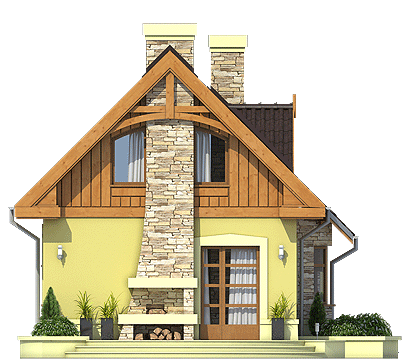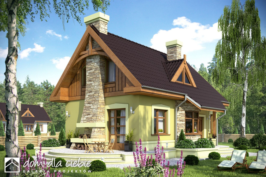 Sympatyczny, niewielki projekt małego domu piętrowego dla 3 do 4-ro osobowej rodziny. Parter jako część ogólna obejmuje: doświetlony z trzech stron pokój dzienny z kominkiem oraz miejscem do spożywania posiłków, kuchnię, pokój sypialny - od strony ogrodowej, wc oraz dostępną z wiatrołapu pralnię + c.o. Piętro to część prywatna, obejmująca: dwie sypialnie oraz wspólną łazienkę. Budynek posiada atrakcyjny zewnętrzny kominek od strony ogrodowej. Ten mały dom z powodzeniem może być wykorzystany jako rekreacyjny - całoroczny... Sprawdź inne projekty domów - Zapraszamy !fundamenty: BETONOWE ściany zewnętrzne: POROTHERM+STYROPIAN TERMO ORGANIKA ściany wewnętrzne: POROTHERM,G-K rodzaj stropu: TERIVA elewacje: TYNK STRUKTURALNY, OKŁADZINA KAMIENNA, OKŁADZINA DREWNIANA pokrycie dachu: DACHÓWKA CEM. lub CER.