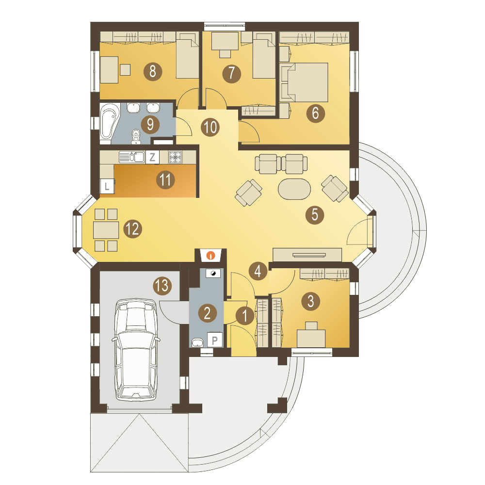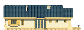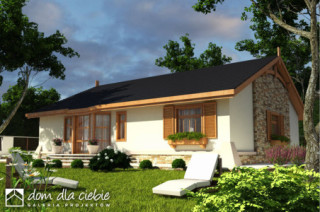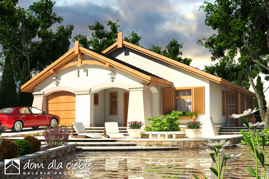 Skromny, wygodny parterowy dom dla 4-5cio osobowej rodziny z wbudowanym garażem. Na stosunkowo małej powierzchni podzielono mieszkanie na strefę nocna i dzienną umożliwiając rodzinie odpowiedni komfort wypoczynku. Wykusze po obu stronach budynku będą dodatkową atrakcją wnętrza strefy dziennej... Sprawdź inne projekty domów - Zapraszamy !fundamenty: BETONOWE ściany zewnętrzne: POROTHERM+STYROPIAN TERMO ORGANIKA ściany wewnętrzne: POROTHERM/ CEGŁ.DZIURAWKA rodzaj stropu: DREWNIANY elewacje: TYNK STRUKTURALNY pokrycie dachu: DACHÓWKA CEM. lub CER.