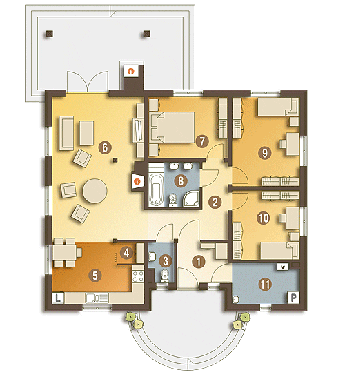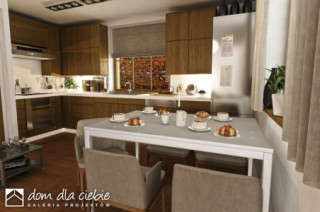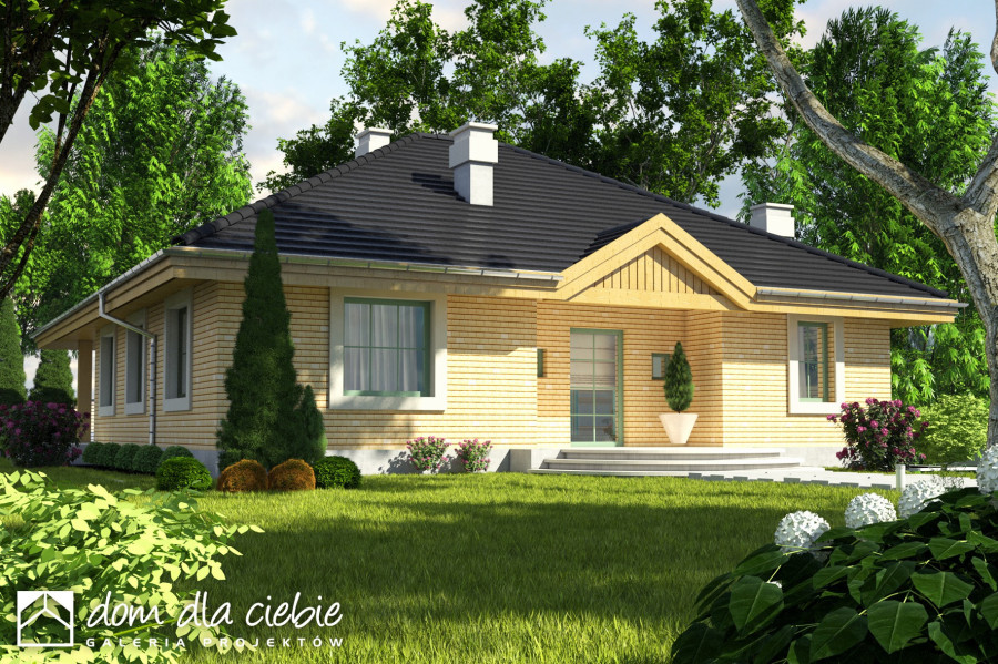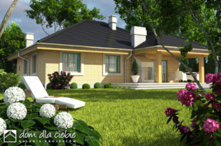 Tomaszek II to dom parterowy, niepodpiwniczony, dla 4-5cio osobowej rodziny o prostej i wyważonej bryle z poddaszem przeznaczonym na cele magazynowe. Czytelny i funkcjonalny rozkład pomieszczeń oraz wyraźny ich podział na strefy dzienną i nocną daje poczucie komfortu i wygody. Strefę dzienną zaprojektowano jako otwartą, łączącą wejście główne i część ogrodową działki. Strefę nocną (3 sypialnie) zorganizowano wokół centralnie umieszczonej łazienki. Obszerny zadaszony taras daje możliwość korzystania z zewnętrznego kominka (grilla) bez względu na warunki atmosferyczne. Centralnie zlokalizowany kominek umożliwia rozprowadzenie ciepła po całym domu.fundamenty: BETONOWE ściany zewnętrzne: POROTHERM+STYROPIAN TERMO ORGANIKA ściany wewnętrzne: POROTHERM/ CEGŁ.DZIURAWKA rodzaj stropu: DREWNIANY elewacje: OKŁADZINA KLINKIEROWA pokrycie dachu: DACHÓWKA CEM. lub CER.
