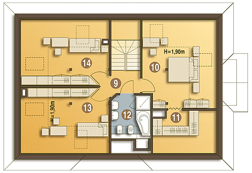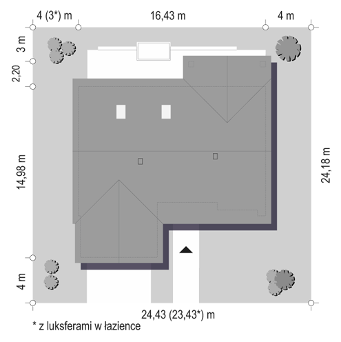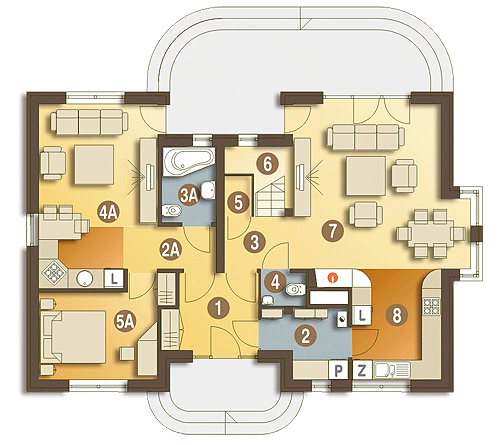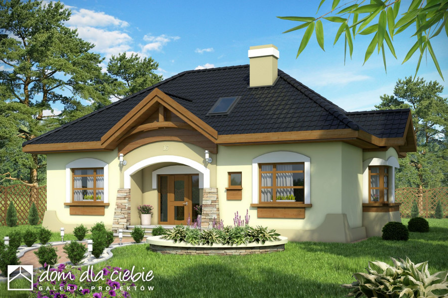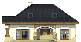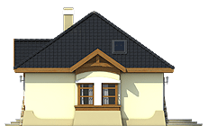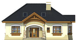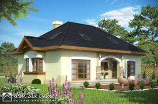 Dom dwupokoleniowy, wolnostojący, niepodpiwniczony. Na stosunkowo niewielkiej powierzchni zaprojektowano 2 wygodne mieszkania: większe dla 4 osób, oraz mniejsze dla 1-2 osób. Mieszkanie mniejsze znajduje się na parterze, natomiast większe zajmuje część parteru oraz całe poddasze. Wejście główne oraz oba wyjścia tarasowe usytuowane są w wygodnych podcieniach, chroniących przed opadami. Wspólny taras łączy oba pokoje dzienne; w większym znalazł miejsce kominek. Pomieszczenie gospodarcze z pralką dostępne jest z wiatrołapu co umożliwia korzystanie z niego wszystkich domowników... Sprawdź inne projekty domów - Zapraszamy !fundamenty: BETONOWE ściany zewnętrzne: POROTHERM+STYROPIAN TERMO ORGANIKA ściany wewnętrzne: POROTHERM, CEGŁ.DZIURAWKA,G-K rodzaj stropu: TERIVA elewacje: TYNK STRUKTURALNY, OKŁADZINA KAMIENNA pokrycie dachu: DACHÓWKA CERAMICZNA