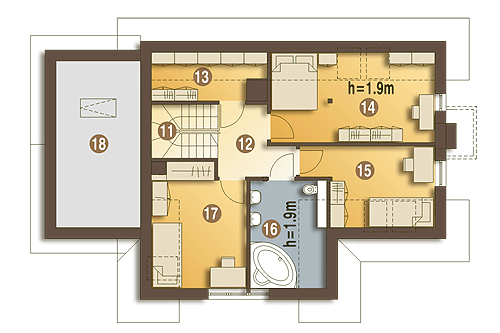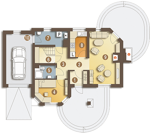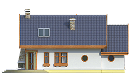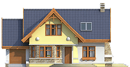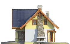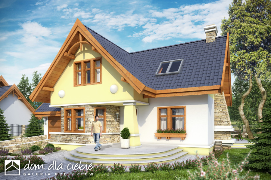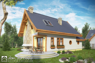 Urokliwy, nieduży domek piętrowy przeznaczony dla 4-5-cio osobowej rodziny. Na parterze zaprojektowano wiatrołap, hol, dodatkowy pokój, salon, oddzielną kuchnię oraz łazienkę. Garaż połączony jest z częścią mieszkalną poprzez pomieszczenie gospodarczo-techniczne, w którym znajduje się piec CO. Obok łazienki znajduje się klatka schodowa prowadząca na poddasze, gdzie znajdują się trzy wygodne sypialnie, duża łazienka oraz garderoba. Przestrzeń nad garażem przeznaczona jest na funkcje pomocnicze np. magazynek i jest dostępne poprzez wyłaz stropowy w garażu.fundamenty: BETONOWE ściany zewnętrzne: POROTHERM+STYROPIAN TERMO ORGANIKA ściany wewnętrzne: POROTHERM rodzaj stropu: TERIVA elewacje: TYNK AKRYLOWY, OKŁADZINA KAMIENNA pokrycie dachu: DACHÓWKA CEM. lub CER