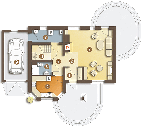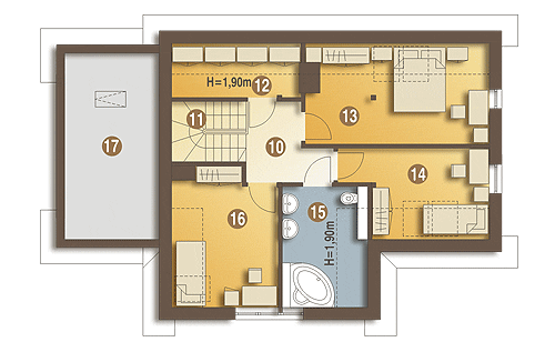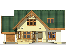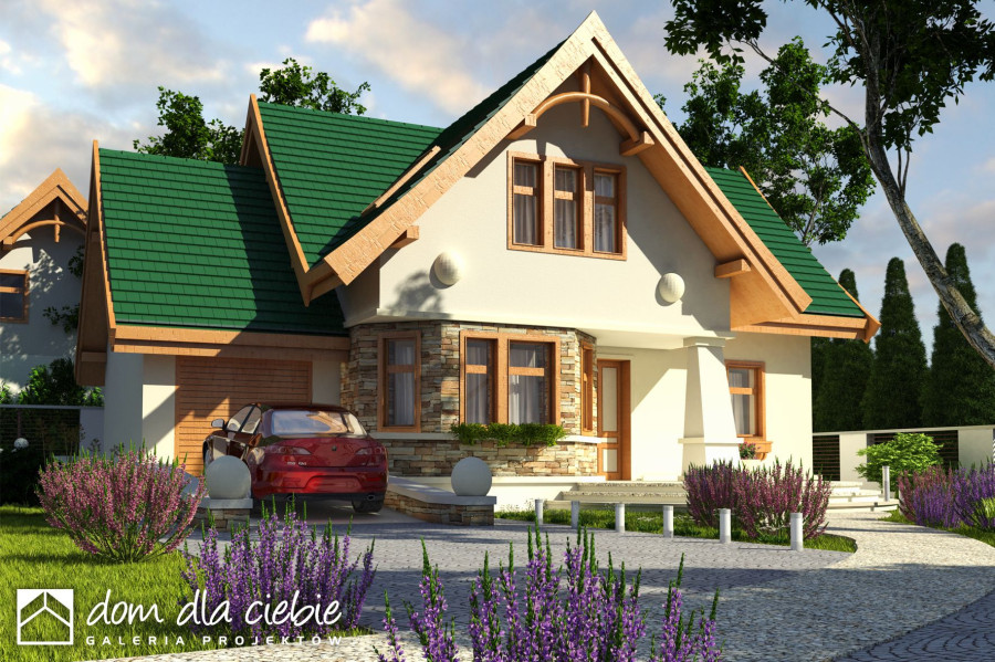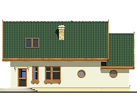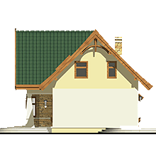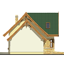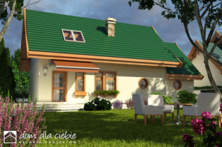 Urokliwy, nieduży domek piętrowy przeznaczony dla cztero osobowej rodziny. Na parterze zaprojektowano wiatrołap, hol, salon, oddzielną kuchnię oraz łazienkę. Garaż połączony jest z częścią mieszkalną poprzez pomieszczenie gospodarczo-techniczne, w którym znajduje się piec CO. Obok łazienki znajduje się klatka schodowa prowadząca na poddasze, gdzie znajdują się trzy wygodne sypialnie, duża łazienka oraz garderoba. Przestrzeń nad garażem przeznaczona jest na funkcje pomocnicze np. magazynek i jest dostępna poprzez wyłaz stropowy w garażu.fundamenty: BETONOWE ściany zewnętrzne: POROTHERM+STYROPIAN TERMO ORGANIKA ściany wewnętrzne: POROTHERM rodzaj stropu: TERIVA elewacje: TYNK AKRYLOWY, OKŁADZINA KAMIENNA pokrycie dachu: DACHÓWKA CEM. lub CER