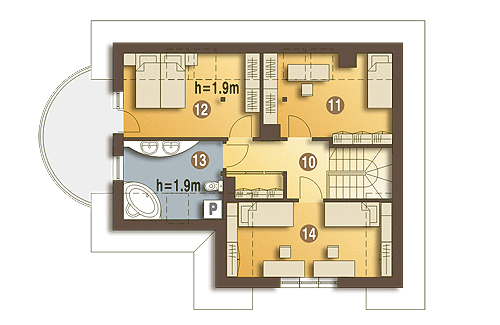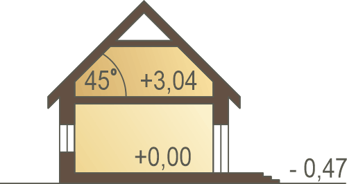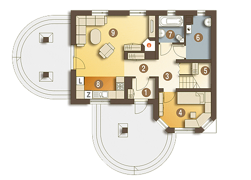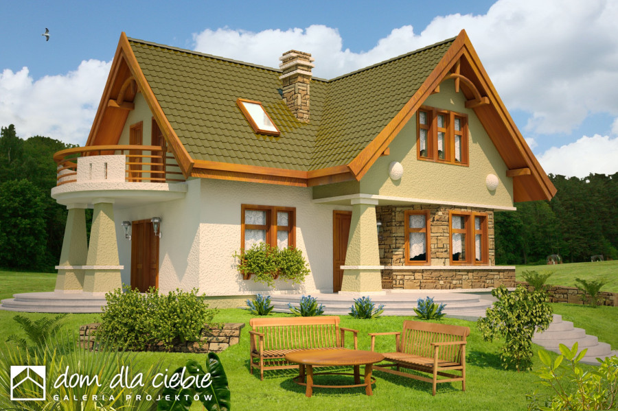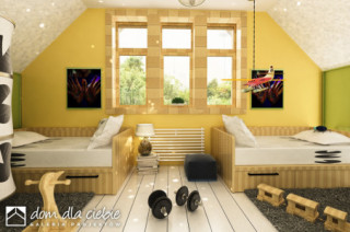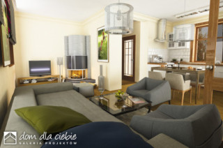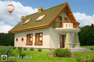 Niewielki domek piętrowy przeznaczony dla 4-5-cio osobowej rodziny. Na parterze zaprojektowano wiatrołap, hol, dodatkowy pokój,(który może służyć jako gabinet), salon (z zadaszonym wyjsciem na ogród), otwartą kuchnię oraz łazienkę. W pomieszczeniu gospodarczo-technicznym znajduje się piec CO. Obok pomieszczenia tech. znajduje się klatka schodowa prowadząca na poddasze, gdzie znajdują się trzy wygodne sypialnie oraz duża łazienka.