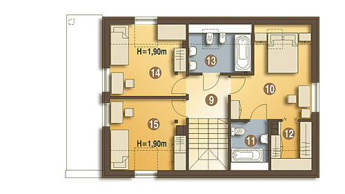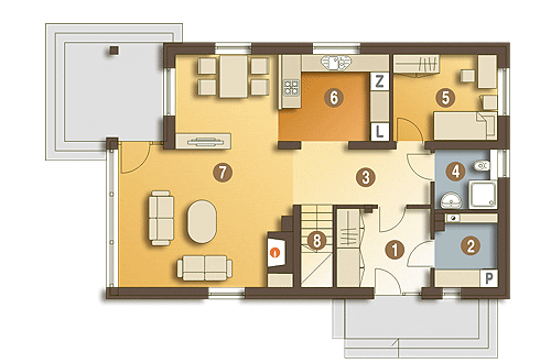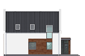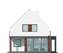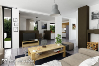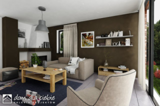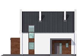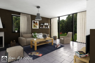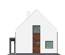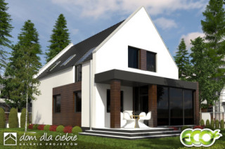 Nowoczesny projekt małego domu jednorodzinnego z charakterystycznym przeszkleniem w salonie. Ten mały dom przeznaczony jest dla 4-5 osobowej rodziny. Przestronny i dobrze oświetlony salon z kominkiem i wyjściem na zadaszony taras daje poczucie komfortu. Przewidziano dodatkowy pokój/gabinet oraz łazienkę na parterze. Znajduje się tam również kuchnia i pomieszczenie gospodarcze z piecem C.O.. Na poddaszu zaprojektowano 3 sypialnie. W sypialniach dzieci zastosowano okna połaciowe zespolone z oknem w ścianie kolankowej - poprawiają one pole widzenia i zwiększają doświetlenie pokoju. Sypialnia rodziców wyposażona jest we własną łazienkę i garderobę.fundamenty: BETONOWE ściany zewnętrzne: POROTHERM+STYROPIAN TERMO ORGANIKA ściany wewnętrzne: POROTHERM, G-K rodzaj stropu: TERIVA elewacje: TYNK AKRYLOWY, OKŁADZINA DREWNIANA pokrycie dachu: DACHÓWKA CERAMICZNA