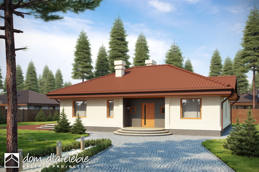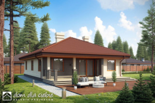 Współczesny dom dla 4-5 osobowej rodziny. Wygodny rozkład funkcjonalny oraz obszerny salon z kuchnią oraz jadalnią gwarantuje wygodę i komfort dla rodziny. Dom podzielony na strefy: wspólną i indywidualną zapewnia odpoczynek mieszkańcom. Poddasze przeznaczone na cele nieużytkowe. Centralnie umieszczony kominek możliwa zastosowanie ogrzewania kominowego.
