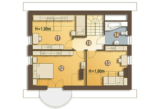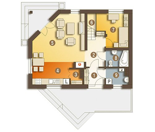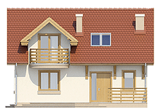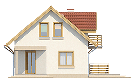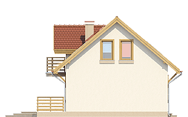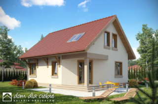 Niewielki dom z użytkowym poddaszem dla 4-5 osobowej rodziny o interesującym układzie funkcjonalnym dającym ciekawy układ wnętrza. Na parterze zaprojektowano część ogólną: salon ze ściętym narożnikiem, kuchnię ze spiżarnią, c.o., łazienkę oraz mały pokój gościnny. Na poddaszu zaprojektowano część prywatną: trzy wygodne pokoje sypialne oraz wspólną łazienkę. Dom z powodzeniem łączy elementy tradycyjnej architektury mieszkaniowej z nowoczesnością.