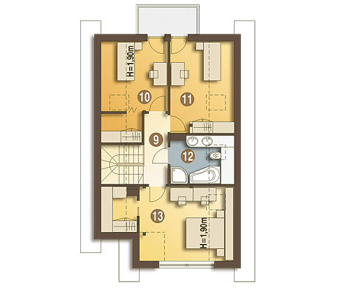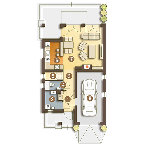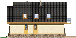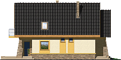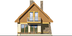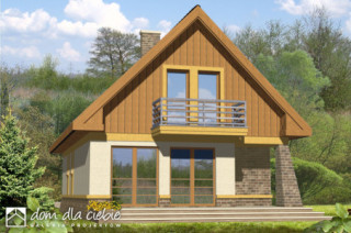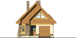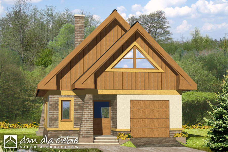 Zgrabny, niewielki dom jednorodzinny, zaprojektowany na wąską działkę, dla 4 osobowej rodziny, nadający się na dom całoroczny lub letniskowy. Drzwi wejściowe oraz jedno z wyjść tarasowych chronione są przed opadami funkcjonalnymi podcieniami. Z wiatrołapu dostępne jest wygodne pom. gospodarcze z piecem CO oraz wbudowany garaż. Kuchnię, w zależności od upodobań inwestorów, można pozostawić otwartą na ustawny pokój dzienny lub zamknąć ścianką działową. Na poddaszu zaprojektowano 3 wygodne sypialnie oraz dość dużą łazienkę.fundamenty: BETONOWE ściany zewnętrzne: POROTHERM+STYROPIAN TERMO ORGANIKA rodzaj stropu: TERIVA I elewacje: TYNK STRUKTURALNY, OKŁ.KLINKIEROWA i DREWNIANA pokrycie dachu: DACHÓWKA CEM. lub CER.
