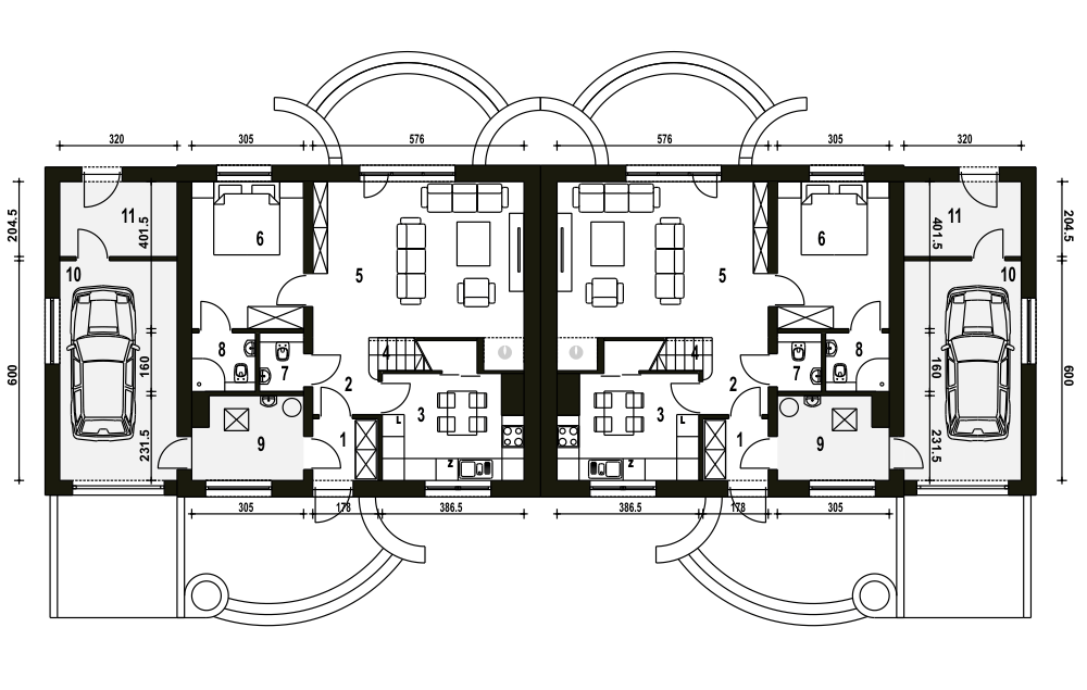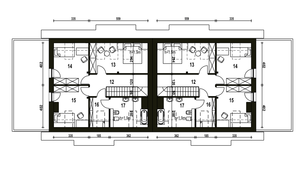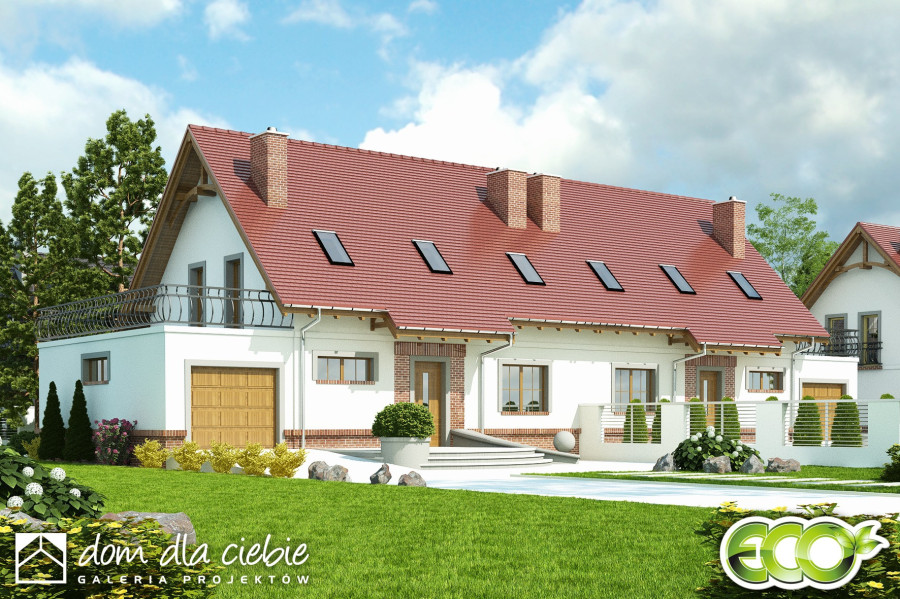 (Uwaga: projekty typu bliźniak oferujemy jako domy dwulokalowe, projekt można zamówić również w zabudowie bliźniaczej) Sosnówka II A-BL2 powstała poprzez połączenie dwóch segmentów ścianami szczytowymi od strony salonu. Poniższy opis dotyczy jednego segmentu: Dom Sosnówka II zaprojektowano na rzucie prostokąta gdzie kalenica jest równoległa względem elewacji frontowej. Doskonale wpisze się na nieduże działki o średniej wielkości i ze względu na typowy kształt będzie się dobrze komponował w każdym otoczeniu. Ze względu na prostą formę projekt ten zalicza się do tanich w budowie i eksploatacji. Widać tu wyraźny podział na strefę dzienną na parterze oraz nocną na poddaszu.Pod schodami umieszczono kominek. Na parterze oprócz przestronnego salonu zaprojektowano osobną kuchnię oraz pokój gościnny z indywidualną łazienką. Na tym poziomie mamy także wc oraz pomieszczenie z piecem co przez które dostaniemy się do garażu.Na poddaszu zaplanowano 3 sypialnie oraz łazienkę i garderobę.