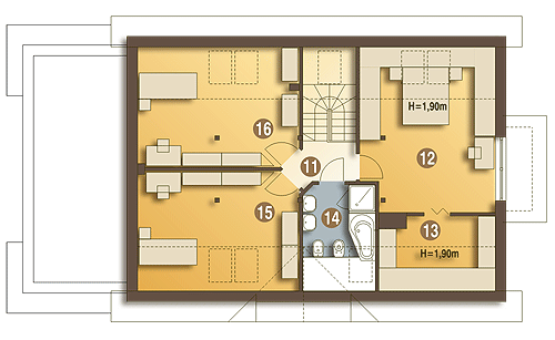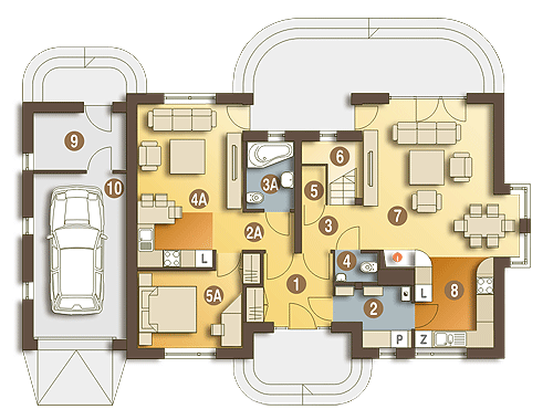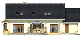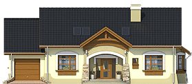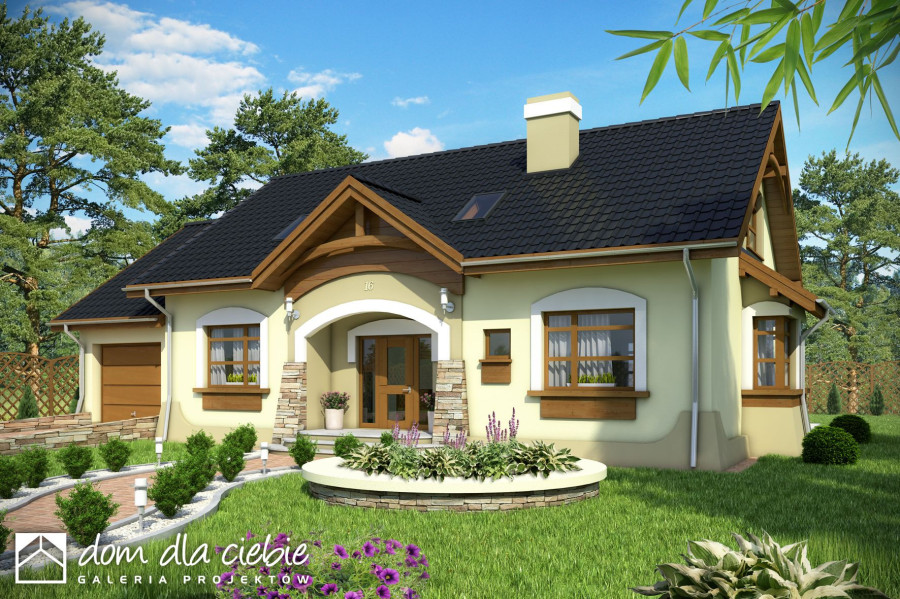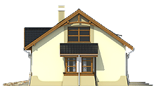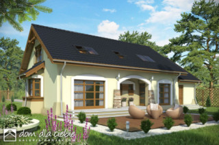 Amelia V to wersja projektu Amelia ale z dachem dwuspadowym. Przy tej samej powierzchni zabudowy oraz wysokości budynku uzyskano obszerniejsze pokoje na poddaszu a co za tym idzie większą powierzchnię użytkową. Amelia V to dom dwupokoleniowy, wolnostojący, niepodpiwniczony. Na stosunkowo niewielkiej powierzchni zaprojektowano 2 wygodne mieszkania: większe dla 4 osób, oraz mniejsze dla 1-2 osób. Mieszkanie mniejsze znajduje się na parterze, natomiast większe zajmuje część parteru oraz całe poddasze. Wejście główne oraz oba wyjścia tarasowe usytuowane są w wygodnych podcieniach, chroniących przed opadami. Wspólny taras łączy oba pokoje dzienne; w większym znalazł miejsce kominek. Pomieszczenie gospodarcze z pralką dostępne jest z wiatrołapu co umożliwia korzystanie z niego wszystkich domowników. Garaż oraz funkcjonalne pom. pomocnicze z wyjściem na ogród, doprojektowano z boku budynku... Sprawdź inne projekty domów - Zapraszamy !