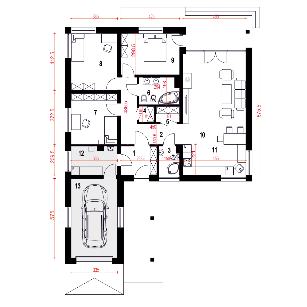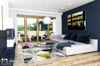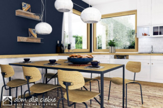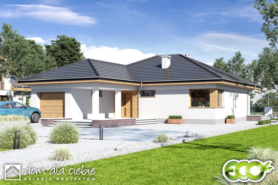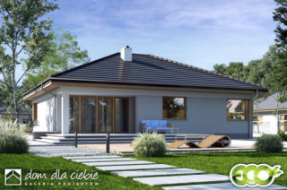 Dom parterowy, niepodpiwniczony, dla 4-5cio osobowej rodziny o prostej i wyważonej bryle z poddaszem przeznaczonym na cele magazynowe. Czytelny i funkcjonalny rozkład pomieszczeń oraz wyraźny ich podział na strefy dzienną i nocną daje poczucie komfortu i wygody. Strefa dzienną zaprojektowano jako otwartą, łączącą wejście główne i część ogrodową działki. Strefę nocną (3 sypialnie) zorganizowano wokół centralnie umieszczonej łazienki, garderoby i spiżarni. Z salonu zaprojektowano wyjście na zadaszony taras. Centralnie zlokalizowany kominek umożliwia rozprowadzenie ciepła po całym domu.fundamenty: BETONOWE ściany zewnętrzne: POROTHERM+STYROPIAN TERMO ORGANIKA ściany wewnętrzne: POROTHERM/ CEGŁ.DZIURAWKA rodzaj stropu: TERIVA I elewacje: TYNK, DREWNO pokrycie dachu: DACHÓWKA CERAMICZNA