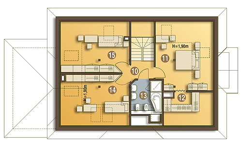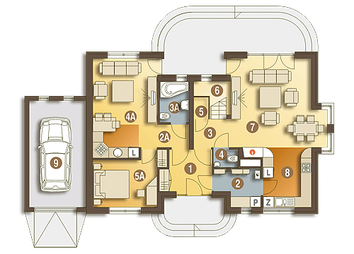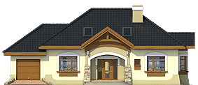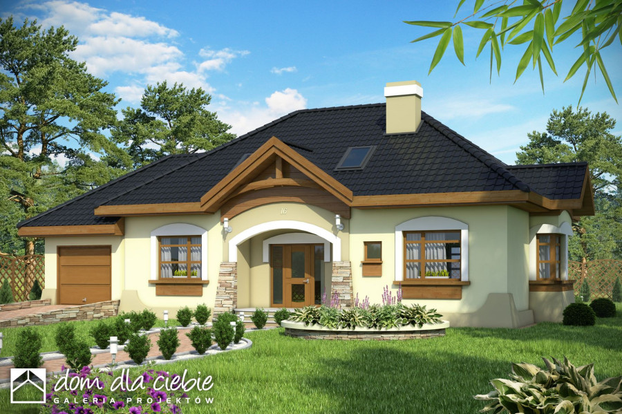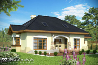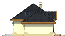 Dom dwupokoleniowy, wolnostojący, niepodpiwniczony. Na stosunkowo niewielkiej powierzchni zaprojektowano 2 wygodne mieszkania: większe dla 4 osób, oraz mniejsze dla 1-2 osób. Mieszkanie mniejsze znajduje się na parterze, natomiast większe zajmuje część parteru oraz całe poddasze. Wejście główne oraz oba wyjścia tarasowe usytuowane są w wygodnych podcieniach, chroniących przed opadami. Wspólny taras łączy oba pokoje dzienne; w większym znalazł miejsce kominek. Pomieszczenie gospodarcze z pralką dostępne jest z wiatrołapu co umożliwia korzystanie z niego wszystkich domowników. Garaż dobudowany jest z boku budynku, od strony mniejszego mieszkania. Sprawdź inne projekty domów - Zapraszamy !
