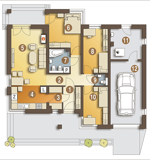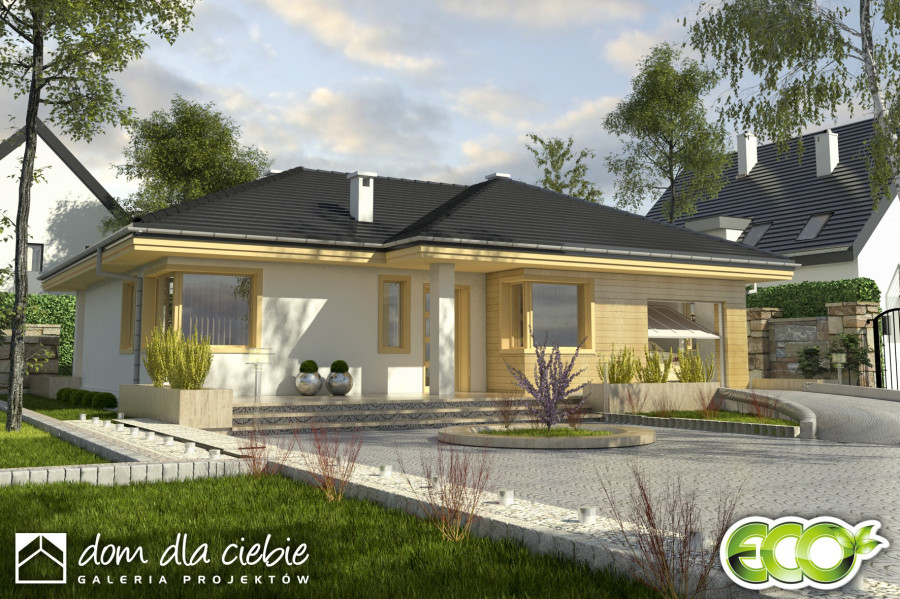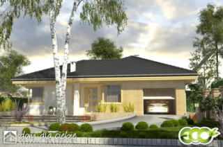 Przepiórka to ekonomiczny dom spełniający wymagania osób szukających rozwiązań wygodnych i funkcjonalnych przy małej powierzchni zabudowy. Jest przeznaczony dla 3-4 osobowej rodziny. Z racji zabudowy parterowej wygodny dla osób starszych. Funkcjonalność Przepiórki podkreśla wyraźny podział na strefy dzienną i nocną oraz łazienki : główną i WC. Przestronny, jasny salon z kominkiem połączony z otwartą kuchnią daje możliwość dogodnej aranżacji wnętrza. Pomieszczenie techniczne, spiżarnia i jednostanowiskowy garaż pozwalają na wygodne i swobodne korzystanie z części gospodarczej domu.fundamenty: BETONOWE ściany zewnętrzne: POROTHERM+STYROPIAN TERMO ORGANIKA ściany wewnętrzne: POROTHERM/ CEGŁ.DZIURAWKA rodzaj stropu: TERIVA elewacje: TYNK STRUKTURALNY pokrycie dachu: DACHÓWKA CEM. lub CER.