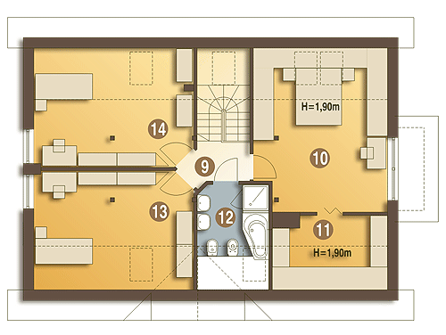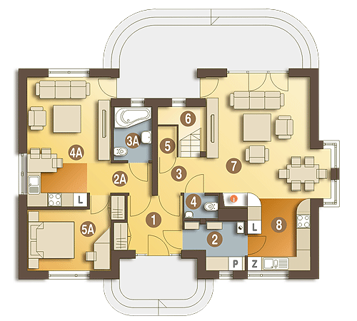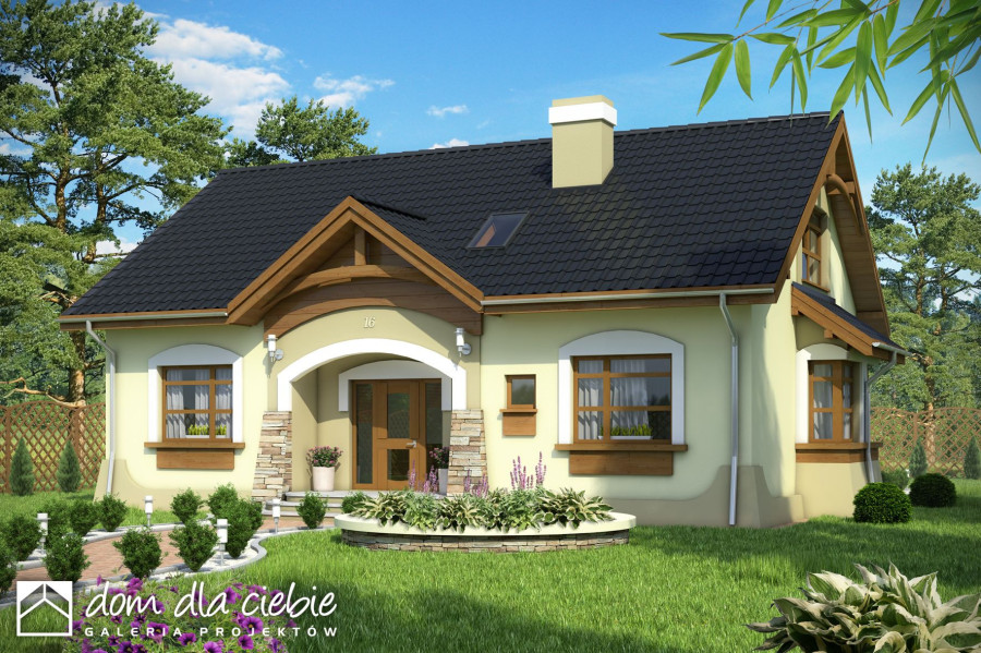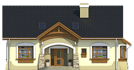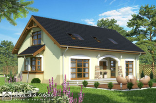 Amelia V to wersja projektu Amelia ale z dachem dwuspadowym. Przy tej samej powierzchni zabudowy oraz wysokości budynku uzyskano obszerniejsze pokoje na poddaszu a co za tym idzie większą powierzchnię użytkową. Amelia V to dom dwupokoleniowy, wolnostojący, niepodpiwniczony. Na stosunkowo niewielkiej powierzchni zaprojektowano 2 wygodne mieszkania: większe dla 4 osób, oraz mniejsze dla 1-2 osób. Mieszkanie mniejsze znajduje się na parterze, natomiast większe zajmuje część parteru oraz całe poddasze. Wejście główne oraz oba wyjścia tarasowe usytuowane są w wygodnych podcieniach, chroniących przed opadami. Wspólny taras łączy oba pokoje dzienne; w większym znalazł miejsce kominek. Pomieszczenie gospodarcze z pralką dostępne jest z wiatrołapu co umożliwia korzystanie z niego wszystkich domowników... Sprawdź inne projekty domów - Zapraszamy !fundamenty: BETONOWE ściany zewnętrzne: POROTHERM+STYROPIAN TERMO ORGANIKA ściany wewnętrzne: POROTHERM, CEGŁ.DZIURAWKA,G-K rodzaj stropu: TERIVA elewacje: TYNK STRUKTURALNY, OKŁADZINA KAMIENNA pokrycie dachu: DACHÓWKA CERAMICZNA