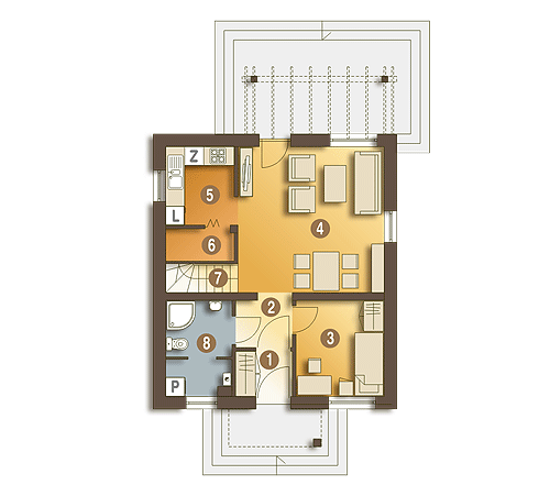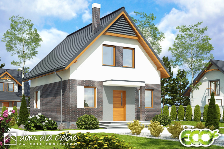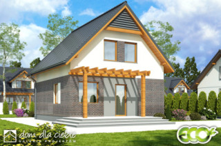 Mały dom jednorodzinny o nowoczesnym charakterze, z prostym dwuspadowym dachem, wykończony okładziną klinkierową. Ze względu na niewielkie wymiary nadaje się na małe, wąskie działki (przenosząc okno w kuchni na tylną ścianę domu zyskujemy dodatkowy metr). Na parterze znajduje się salon z wydzieloną częścią wypoczynkową i jadalną, połączony z niewielką kuchnią. Do kuchni przylega spiżarnia. Taras zacieniony jest drewnianą pergolą, a wejście do domu praktycznym, nowoczesnym zadaszeniem. Na parterze przewidziano również pokój/gabinet oraz niewielką łazienkę, z wydzielonym miejscem na piec c.o. Na poddaszu znajdują się 3 przytulne sypialnie oraz łazienka. Projekt należy do serii Eco – małych, prostych konstrukcyjnie domów, ekonomicznych w budowie i użytkowaniu. Dostępny również w wersji z garażem. ...Sprawdź inne nasze projekty domów. Zapraszamy!fundamenty: BETONOWE ściany zewnętrzne: POROTHERM+STYROPIAN TERMO ORGANIKA rodzaj stropu: TERIVA I elewacje: TYNK STRUKTURALNY, OKŁADZINA KLINKIEROWA pokrycie dachu: DACHÓWKA CERAMICZNA