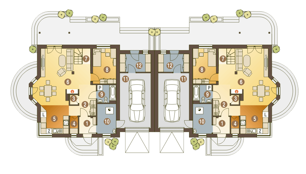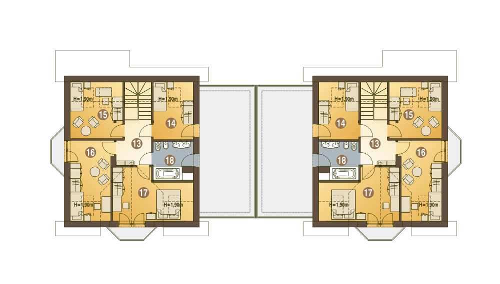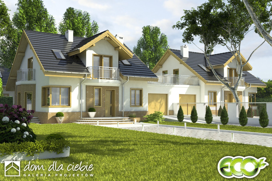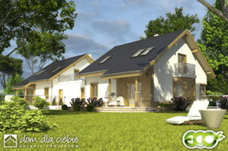 (Uwaga: projekty typu bliźniak oferujemy jako domy dwulokalowe, projekt można zamówić również w zabudowie bliźniaczej) Poniższy opis dotyczy jednego segmentu: Klasyczny dom z użytkowym poddaszem nawet dla 5-6cio osobowej rodziny, o proporcjonalnym wyglądzie i wyważonych detalach. Na parterze znajdziemy otwartą przestrzeń obejmującą salon ze schodami na poddasze, jadalnię oraz kuchnię ze spiżarnią. Zaprojektowano tu także dodatkowy pokój, dużą łazienkę oraz sporą kotłownię przewidzianą na różne rodzaje paliw ( do wyboru). Z kotłowni przechodzimy do garażu i dalej do pomieszczenia gospodarczego. Na tym poziomie znajdziemy także kominek oraz garderobę. Piętro przeznaczone na strefę indywidualną to cztery sypialnie i łazienka z wyjściem na taras. Mamy tu również taras wygospodarowany na garażem i pomieszczeniem gospodarczym. Puszczyk to uroczy dom z efektownym zadaszeniem w formie balkonu nad wejściem. Tradycyjna architektura budynku świetnie wpisze się w każdy krajobraz.