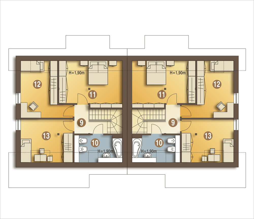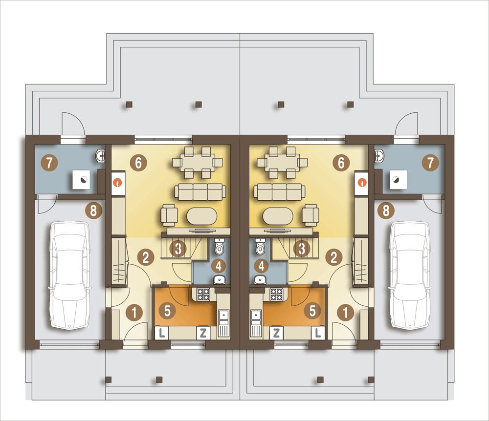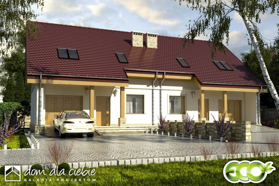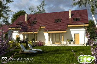 (Uwaga: projekty typu bliźniak oferujemy jako domy dwulokalowe, projekt można zamówić również w zabudowie bliźniaczej) Projekt gotowy Szczęśliwa II zawiera w swoim programie na parterze wiatrołap, hol, kuchnię, WC, garaż, kotłownię salon. Na piętro dostać się można przez wygodne schody. Tu wokół przedpokoju zaprojektowano trzy sypialnie i łazienkę. Szczęśliwa II to projekt domu o niewielkich gabarytach i wybitnie prostej formie przez co z pewnością będzie tani w budowie i eksploatacji.