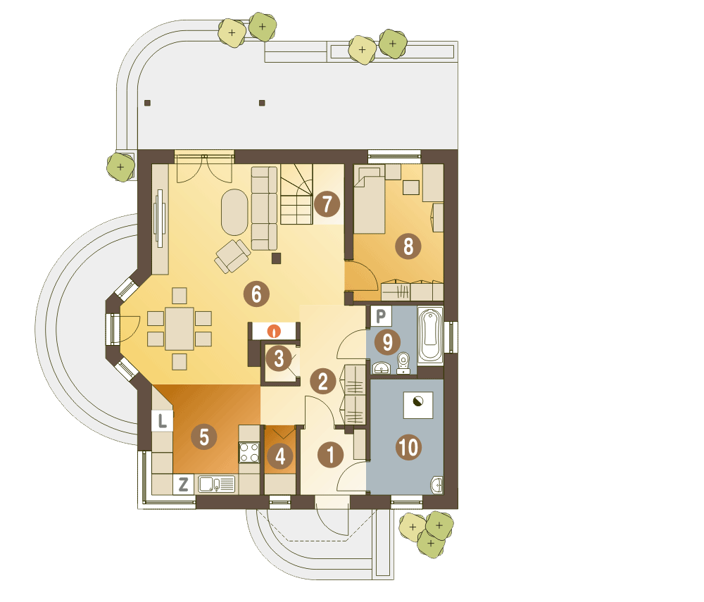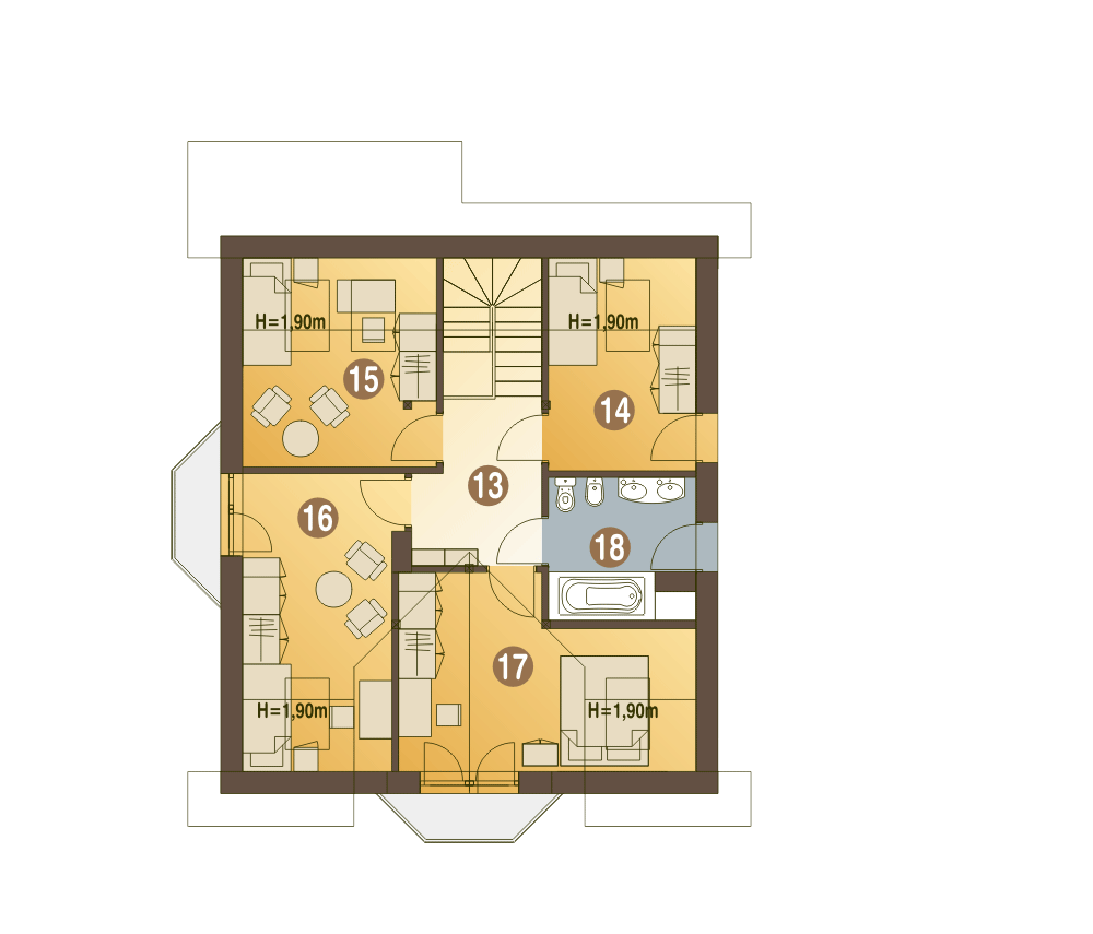 Klasyczny dom z użytkowym poddaszem nawet dla 5-6cio osobowej rodziny, o proporcjonalnym wyglądzie i wyważonych detalach. Na parterze znajdziemy otwartą przestrzeń obejmującą salon ze schodami na poddasze, jadalnię oraz kuchnię ze spiżarnią. Zaprojektowano tu także dodatkowy pokój, dużą łazienkę oraz sporą kotłownię przewidzianą na różne rodzaje paliw ( do wyboru). Na tym poziomie znajdziemy także kominek oraz garderobę. Piętro przeznaczone na strefę indywidualną to cztery sypialnie i łazienka z wyjściem na taras. Puszczyk to uroczy dom z efektownym zadaszeniem w formie balkonu nad wejściem. Tradycyjna architektura budynku świetnie wpisze się w każdy krajobraz.