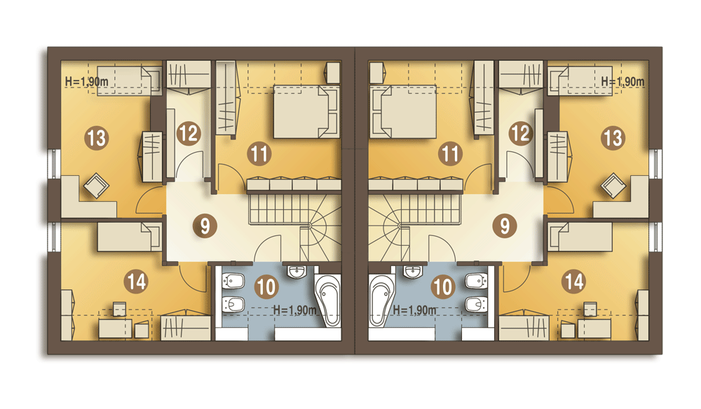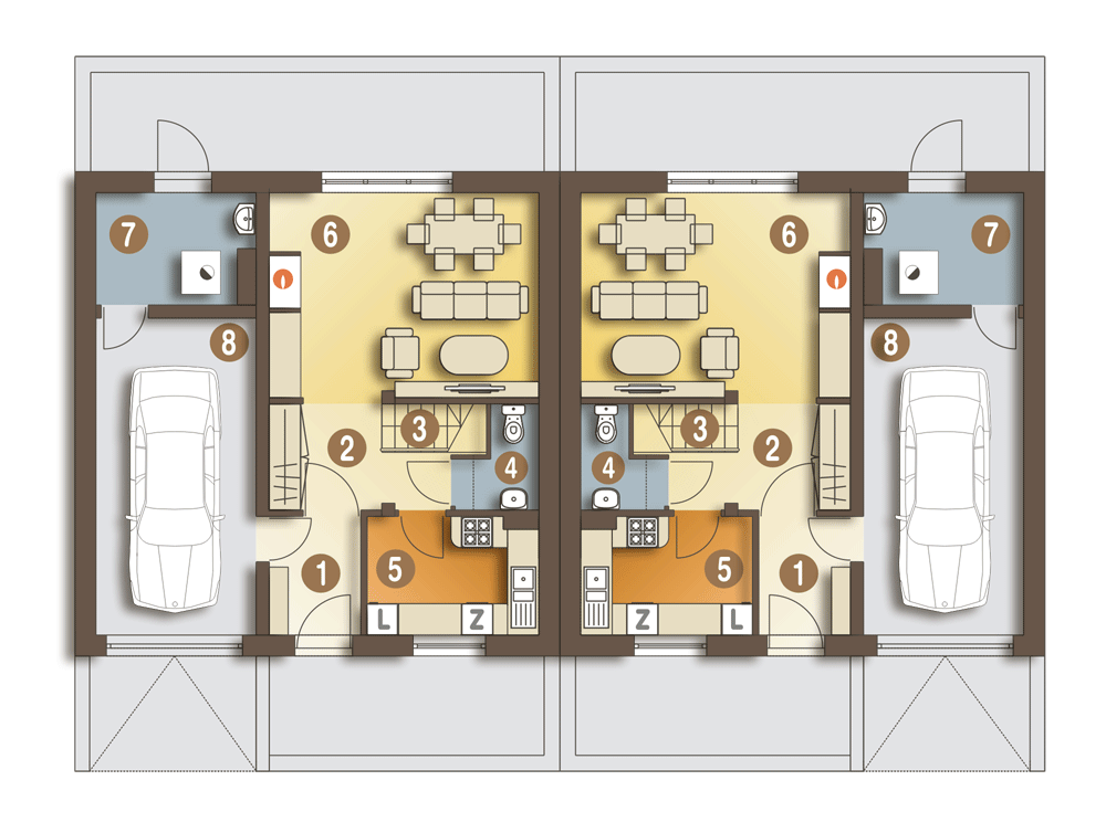 (Uwaga: projekty typu bliźniak oferujemy jako domy dwulokalowe, projekt można zamówić również w zabudowie bliźniaczej) Projekt gotowy Szczęśliwa zawiera w swoim programie na parterze wiatrołap, hol kuchnię, WC, garaż, kotłownię salon. Na piętro dostać się można przez wygodne schody. Tu wokół przedpokoju zaprojektowano trzy sypialnie garderobę i łazienkę. Szczęśliwa to projekt domu o niewielkich gabarytach i wybitnie prostej formie przez co z pewnością będzie tani w budowie i eksploatacji.