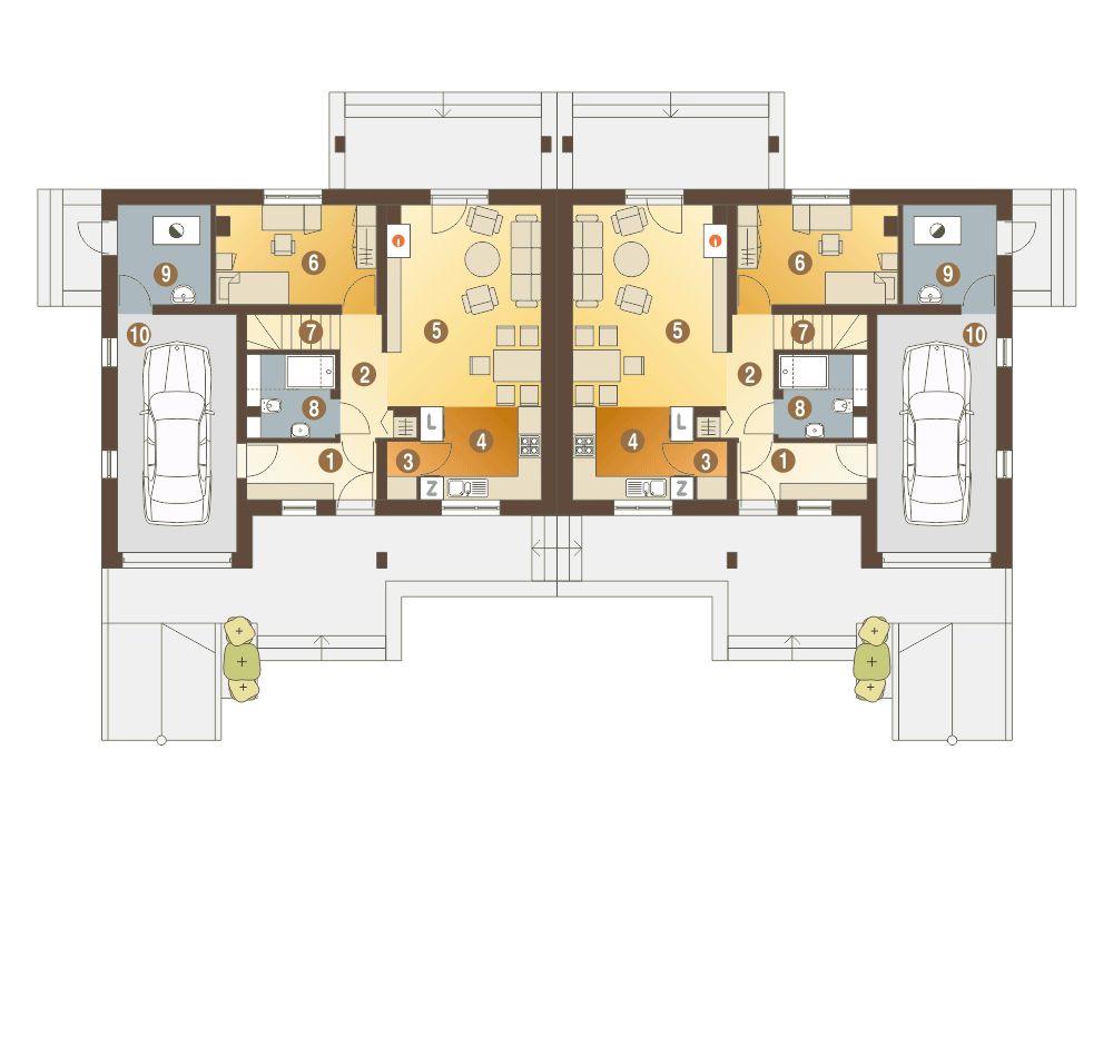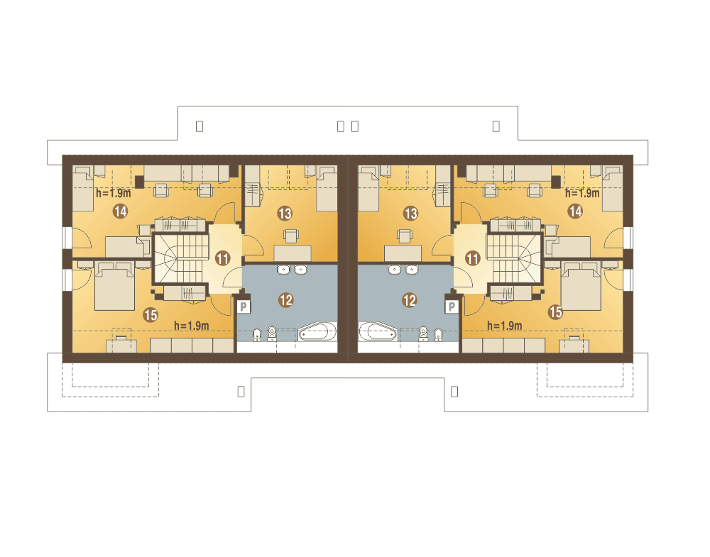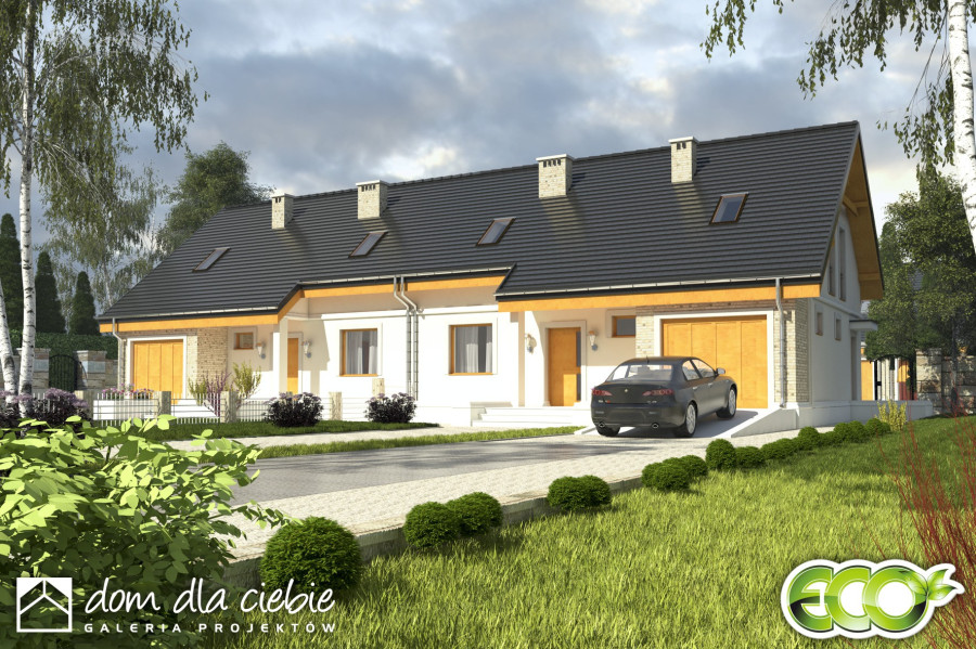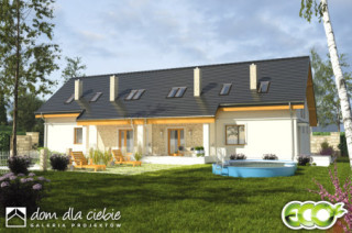 (Uwaga: projekty typu bliźniak oferujemy jako domy dwulokalowe, projekt można zamówić również w zabudowie bliźniaczej) Projekt bliźniaka Alka A-BL2 to połączenie dwóch segmentów ścianami szczytowymi od strony salonu. Opis dotyczy jednego segmentu. Gotowy projekt Alka to propozycja niewielkiego domu dla 4-5 osobowej rodziny. Projekt pokrywa się z tendencjami rynkowymi - jest ekonomiczny, zwarty, z wymagającą funkcją i atrakcyjnym tradycyjnym wyglądem. Alka mieści w swojej kubaturze 5 pokoi (salon + 4 osobne pokoje). Salon stanowiący centrum domu, połączony jest z kuchnią, przy której zaprojektowano niewielką spiżarnię. Salon posiada wyjście na zadaszony taras sprzyjający relaksowi na świeżym powietrzu oraz kominek. W głębi domu, na parterze przewidziano dostępny z holu pokój gościnny mogący służyć również jako gabinet. Pod schodami prowadzącymi na poddasze zaprojektowano łazienkę z prysznicem. Wiatrołap stanowi również przejście do garażu, z którego można dostać się do kotłowni na paliwo stałe. Na piętrze zaproponowano dostępne z holu: duży salon kąpielowy oraz trzy sypialnie.