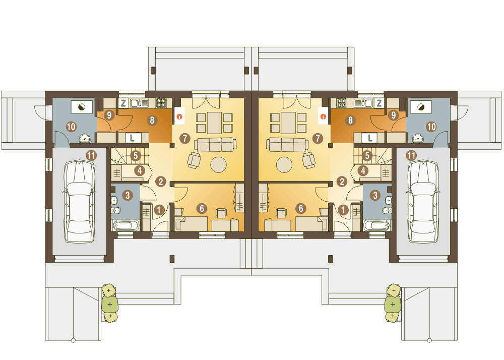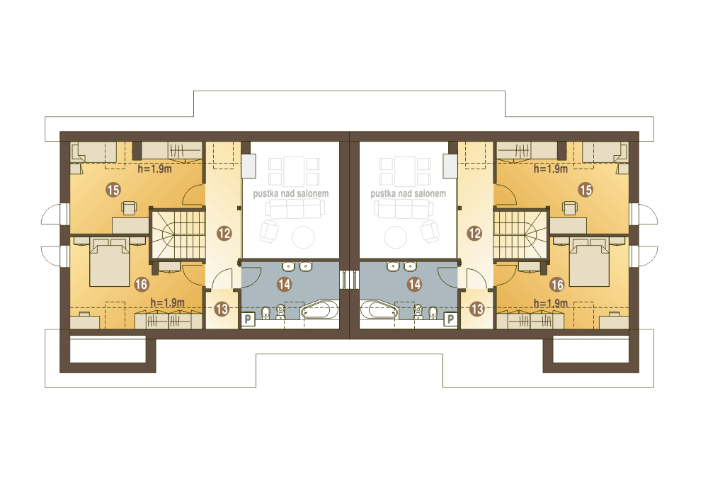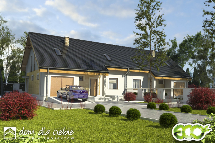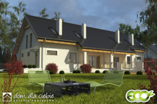 (Uwaga: projekty typu bliźniak oferujemy jako domy dwulokalowe, projekt można zamówić również w zabudowie bliźniaczej) Alka II A-BL2 został utworzony poprzez połączenie dwóch segmentów ścianami od strony salonów. Poniższy opis odnosi się do jednego segmentu .Gotowy projekt Alka II to propozycja niewielkiego domu dla 4 osobowej rodziny. Główną wspólną przestrzeń domu stanowi sąsiadujący z kuchnią salon z kominkiem. Przestrzeń nad salonem jest otwarta do dachu, zaprojektowano tam antresolę z dostępem do pomieszczeń na piętrze. Obok kuchni przewidziano przejściową spiżarnię do pomieszczenia kotłowni z piecem CO na paliwo stałe. Na parterze zaplanowano również dostępny z holu pokój gościnny mogący również pełnić rolę gabinetu. Pod schodami zaprojektowano małą garderobę - szafę, a obok schodów łazienkę. Na piętrze zaproponowano duży salon kąpielowy, garderobę oraz dwie sypialnie dostępne z holu i antresoli. Budynek wyposażony został we wbudowany garaż jednostanowiskowy.