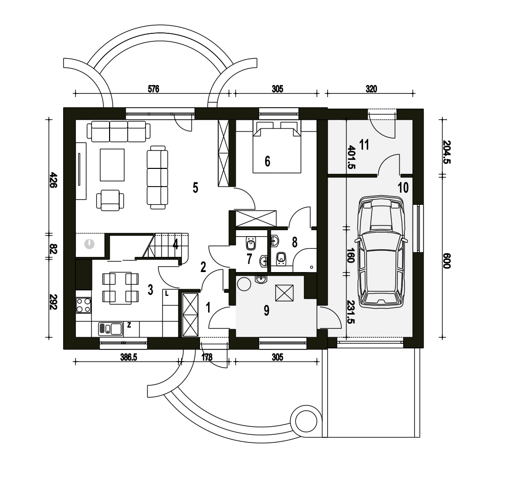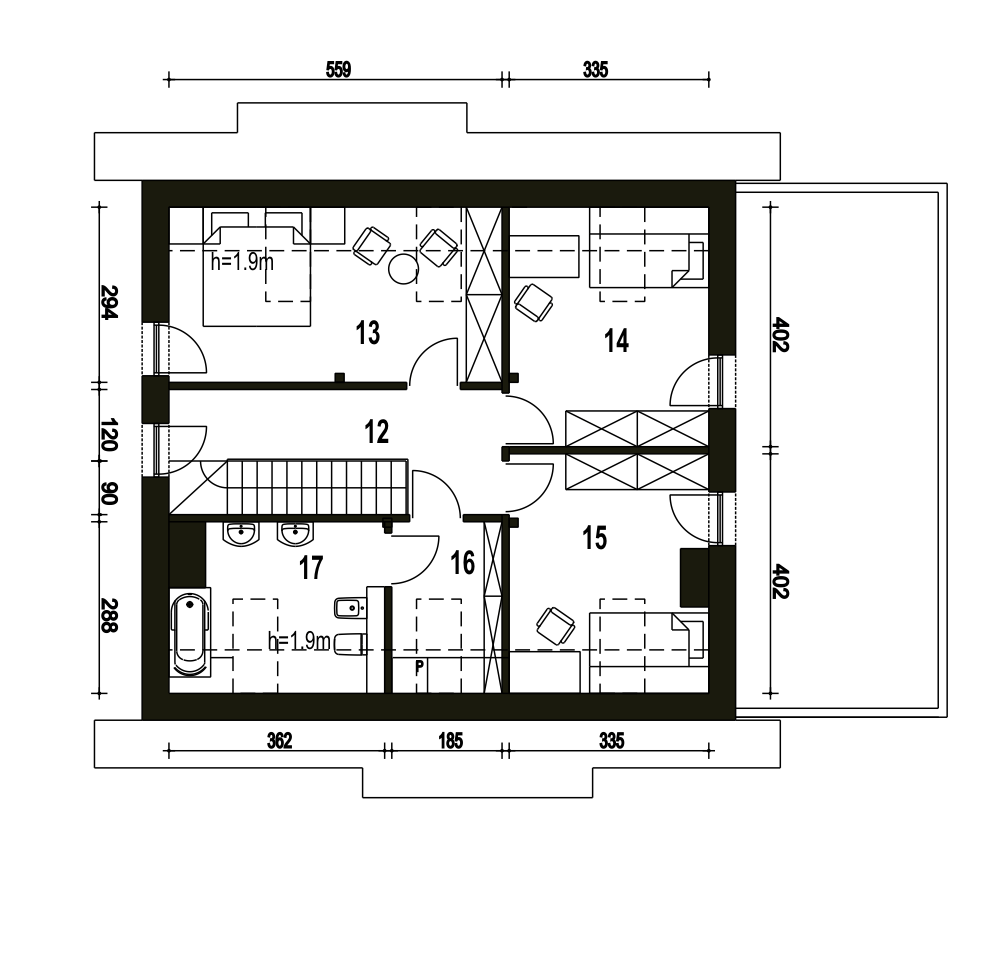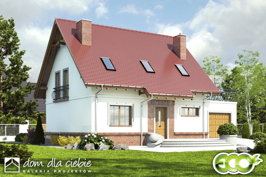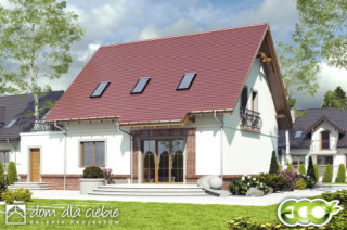 Dom Sosnówka II zaprojektowano na rzucie prostokąta gdzie kalenica jest równoległa względem elewacji frontowej. Doskonale wpisze się na nieduże działki o średniej wielkości i ze względu na typowy kształt będzie się dobrze komponował w każdym otoczeniu. Ze względu na prostą formę projekt ten zalicza się do tanich w budowie i eksploatacji. Widać tu wyraźny podział na strefę dzienną na parterze oraz nocną na poddaszu.Pod schodami umieszczono kominek. Na parterze oprócz przestronnego salonu zaprojektowano osobną kuchnię oraz pokój gościnny z indywidualną łazienką. Na tym poziomie mamy także wc oraz pomieszczenie z piecem co przez które dostaniemy się do garażu.Na poddaszu zaplanowano 3 sypialnie oraz łazienkę i garderobę.fundamenty: BETONOWE ściany zewnętrzne: POROTHERM+STYROPIAN TERMO ORGANIKA rodzaj stropu: TERIVA I elewacje: TYNK STRUKTURALNY, OKŁADZINA KLINKIEROWA pokrycie dachu: DACHÓWKA CERAMICZNA