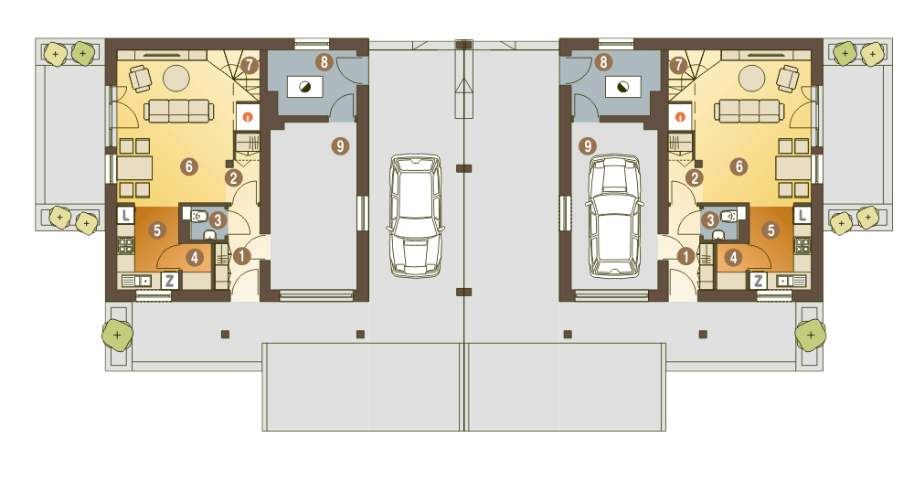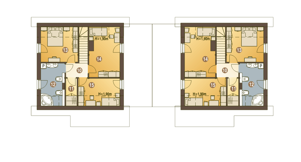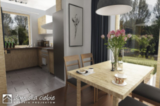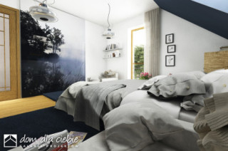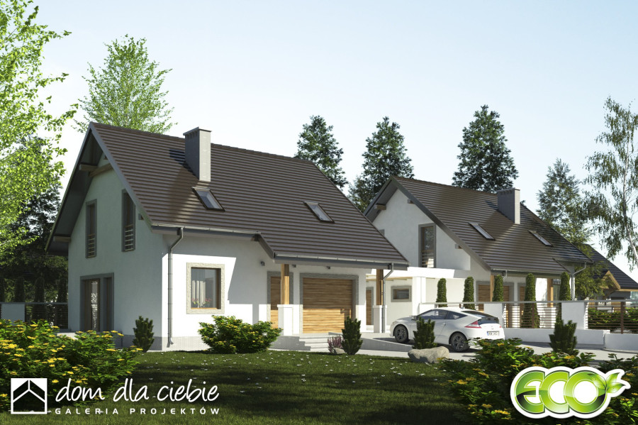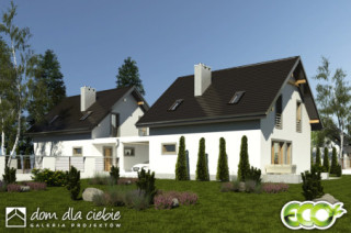 (Uwaga: ten projekt typu bliźniak oferujemy tylko jako dom dwulokalowy). Turkawka A1-BL powstanie poprzez połączenie wiatami dwóch segmentów. Poniższy opis dotyczy jednego segmentu.Projekt gotowy Turkawka zawiera w swoim programie użytkowym:salon z jadalnią, otwarta kuchnią, schodami na górę i kominkiem oraz witryna ogrodową. Na parterze po za tym znajdują się jeszcze takie pomieszczenia jak: garderoba wiatrołap , WC, garaż i kotłownia oraz spiżarnia. Piętro składa się z przedpokoju, trzech sypialni i łazienki oraz garderoby. Turkawka jest bardzo prosta i oszczędna - będzie tania w budowie i ekonomiczna.