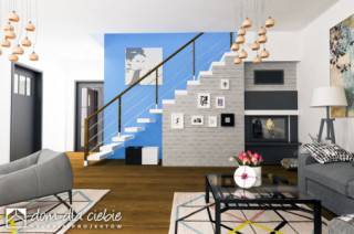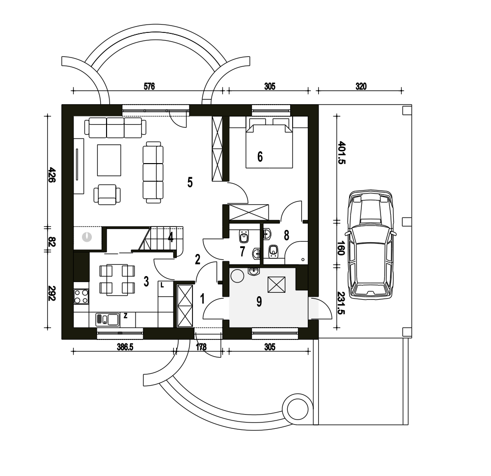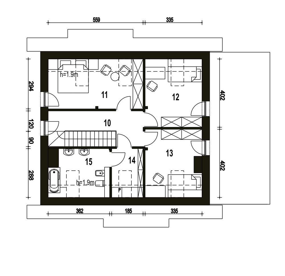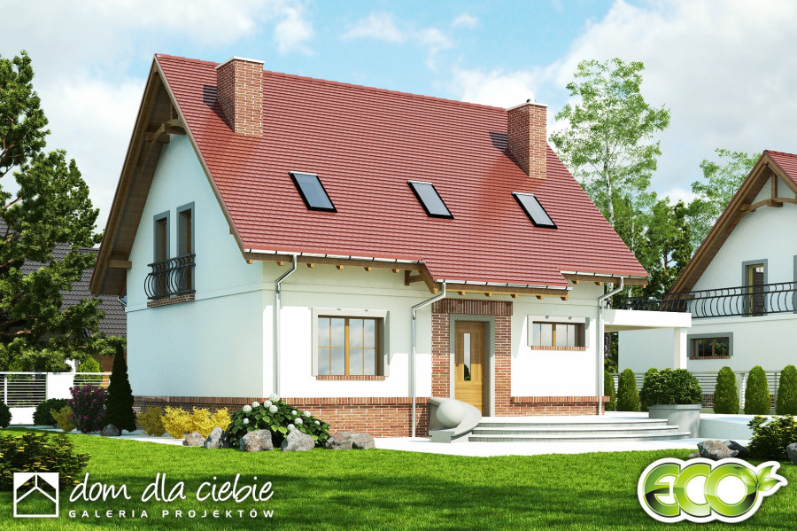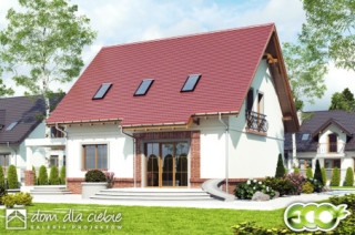 Dom Sosnówka II zaprojektowano na rzucie prostokąta gdzie kalenica jest równoległa względem elewacji frontowej. Doskonale wpisze się na nieduże działki o średniej wielkości i ze względu na typowy kształt będzie się dobrze komponował w każdym otoczeniu. Ze względu na prostą formę projekt ten zalicza się do tanich w budowie i eksploatacji. Widać tu wyraźny podział na strefę dzienną na parterze oraz nocną na poddaszu.Pod schodami umieszczono kominek. Na parterze oprócz przestronnego salonu zaprojektowano osobną kuchnię oraz pokój gościnny z indywidualną łazienką. Na tym poziomie mamy także wc oraz kotłownię pomieszczenie z piecem co przez które dostaniemy na zewnątrz wprost pod wiatę na 1 samochód.Na poddaszu zaplanowano 3 sypialnie oraz łazienkę i garderobę.