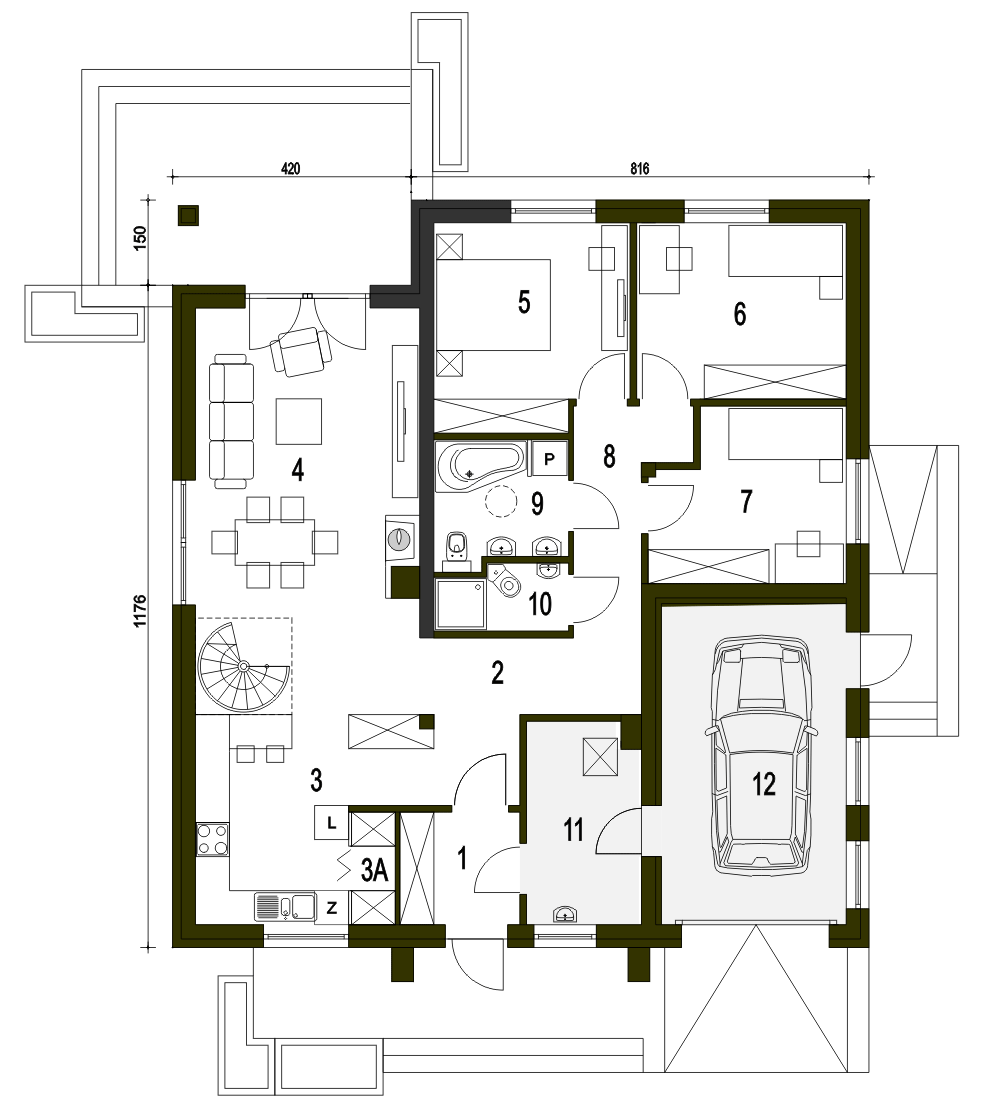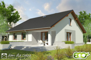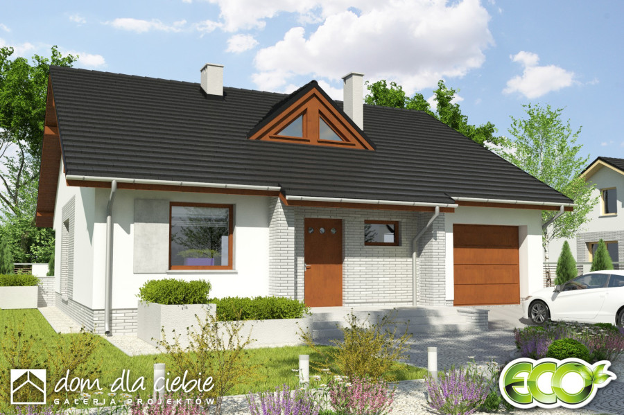 Alf II na paliwo stałe to propozycja niewielkiego domu parterowego z poddaszem do adaptacji na cele użytkowe. Urokliwy, bardzo prosty dom z dachem dwuspadowym, dla 3-4-osobowej rodziny. Budynek na niewielkiej powierzchni mieści wszystkie potrzebne pomieszczenia: 3 sypialnie, salon z wyjściem na zadaszony taras, kuchnię ze spiżarnią, pralnię z przejściem do garażu, WC, łazienkę, oraz kotłownię na paliwo stałe z wejściem zarówno od ogrodu jak i z domu poprzez garaż. W holu zlokalizowano wygodne schody na poddasze, gdzie po adaptacji na cele użytkowe, zmieszczą się np. dwa pokoje oraz składzik. Dom ten dzięki niewielkim gabarytom, prostej bryle, dwuspadowym dachu oraz nieskomplikowanym rozwiązaniom konstrukcyjnym daje możliwość niedrogiej realizacji.fundamenty: BETONOWE ściany zewnętrzne: PUSTAK CERAM. POROTHERM+STYROPIAN TERMO ORGANIKA ściany wewnętrzne: PUSTAK POROTHERM rodzaj stropu: TERIVA elewacje: TYNK STRUKTURALNY/OKŁ. KAMIENNA/KLINKIEROWA pokrycie dachu: DACHÓWKA CEM. lub CER.