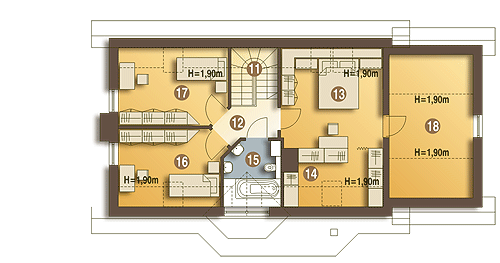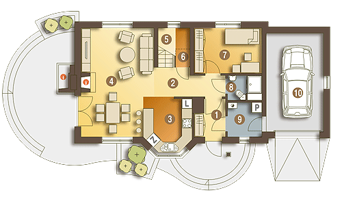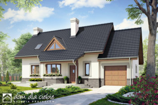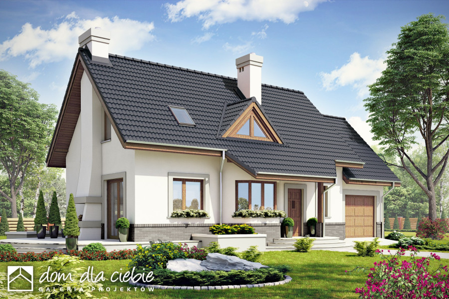 Agatka II styl z garażem to powiększona wersja bardzo popularnego projektu naszego autorstwa z Galerii Projektów Dom Dla Ciebie - o nazwie Agatka, posiadając również wersję styl. Agatka II styl przy niedużej powierzchni posiada aż 5 pokoi mieszkalnych. Dom w wersji stylowej, jest atrakcyjną propozycją dla osób szukających przytulnego i niedrogiego domu z poddaszem użytkowym dla 4 do 5-cio osobowej rodziny. Parter jako część ogólna obejmuje: doświetlony z trzech stron pokój dzienny z kominkiem oraz jadalnią, kuchnię, pokój sypialny - od strony ogrodowej, łazienkę oraz dostępną z wiatrołapu pralnię + c.o. z piecem na paliwo gazowe. Poddasze to część prywatna, obejmująca: aż trzy sypialnie oraz wygodną wspólną łazienkę. Budynek posiada oryginalny zewnętrzny kominek tarasowy od strony ogrodowej, w tej wersji wykończony na biało - identycznie jak elewacja budynku. Dom z powodzeniem może być wykorzystany jako rekreacyjny.