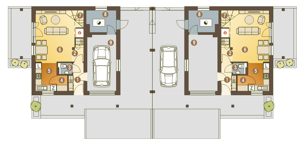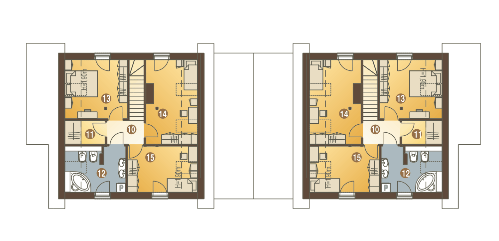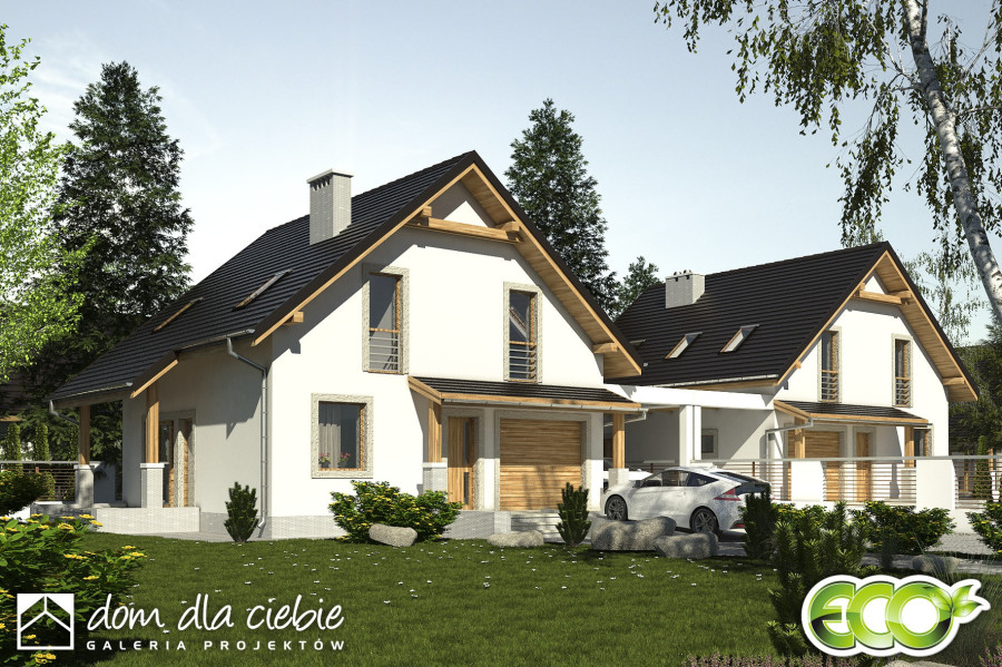(Uwaga: ten projekt typu bliźniak oferujemy tylko jako dom dwulokalowy). Turkawka II A1-BL to budynek, który powstanie po zestawieniu dwóch segmentów Turkawki II A1 (lustrzane odbicie) od strony wiat. Projekt gotowy Turkawka II zawiera w swoim programie użytkowym: salon z jadalnią, otwarta kuchnią, schodami na górę i kominkiem oraz witryna ogrodową. Na parterze po za tym znajdują się jeszcze takie pomieszczenia jak: garderoba wiatrołap , WC, garaż i kotłownia oraz spiżarnia. Piętro składa się z przedpokoju, trzech sypialni i łazienki oraz garderoby. Turkawka jest bardzo prosta i oszczędna - będzie tania w budowie i ekonomiczna.