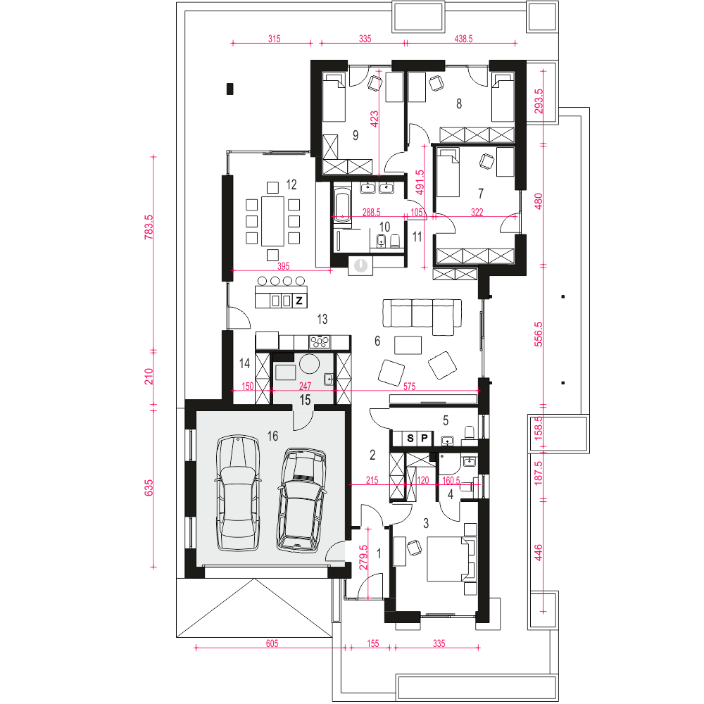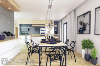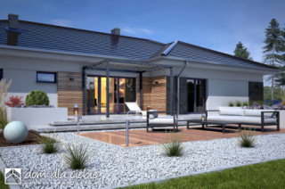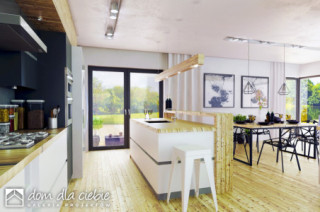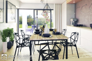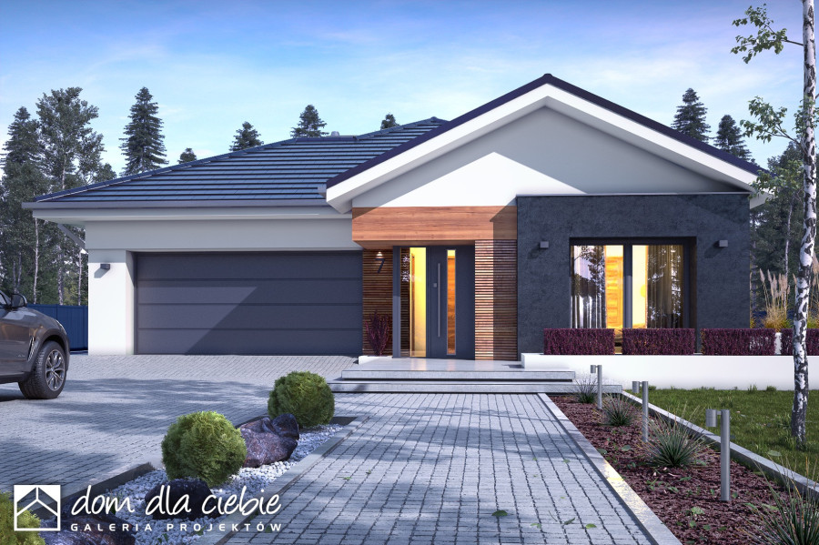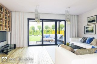 Projekt Galena II jest domem dużym, rozłożystym dopasowanym do wielkości standardowych działek na nowoczesnych osiedlach. Dla wszystkich szukających domu o bezkompromisowej funkcji projekt Galena II jest idealnym rozwiązaniem. Galena to projekt z podwójnym garażem, czterema sypialniami w tym jedną podwójną - typu master bedroom z indywidualna łazienką i garderobą. Przestrzeń wspólną stanowi komfortowe wnętrze salonu z otwartą kuchnią, wyspą kuchenną, jadalnią, miejscem z kominkiem i wejściem na zadaszony luksusowy taras w podcieniu domu. Uzupełnieniem funkcji domu są pomieszczenia takie jak WC, spiżarnia przy kuchni, pomieszczenie techniczne z pralką i suszarką . Piękne duże przeszklenia od strony wszystkich pokoi, jadalni i salonu umożliwią dostęp dobrego dziennego światła dla mieszkańców tego wymarzonego domu. Elewacje domu zostały zaprojektowane z myślą o nowoczesnej stylistyce i luksusowej funkcji domu.fundamenty: BETONOWE ściany: POROTHERM+STYROPIAN rodzaj stropu: prefabrykowane wiązary dachowe Mitek elewacje: TYNK STRUKTURALNY pokrycie dachu: DACHÓWKA CEM. lub CER.