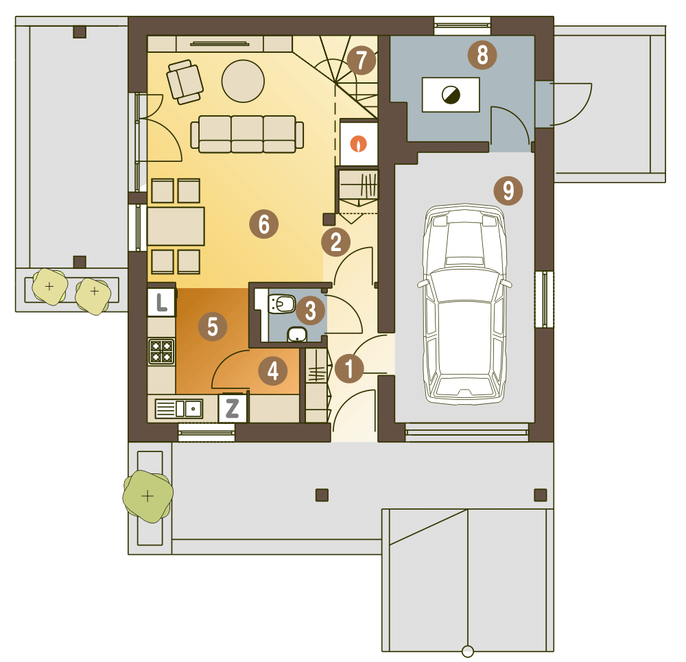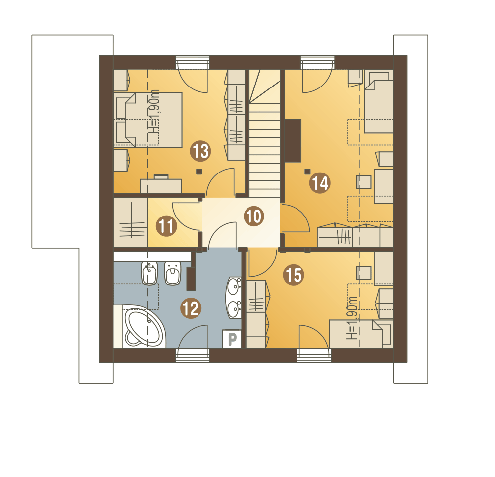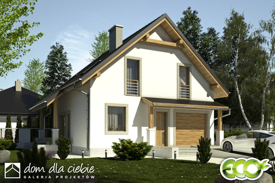 Projekt gotowy Turkawka II zawiera w swoim programie użytkowym:salon z jadalnią, otwarta kuchnią, schodami na górę i kominkiem oraz witryna ogrodową. Na parterze po za tym znajdują się jeszcze takie pomieszczenia jak: garderoba wiatrołap , WC, garaż i kotłownia oraz spiżarnia. Piętro składa się z przedpokoju, trzech sypialni i łazienki oraz garderoby. Turkawka jest bardzo prosta i oszczędna - będzie tania w budowie i ekonomiczna.fundamenty: BETONOWE ściany zewnętrzne: POROTHERM+STYROPIAN TERMO ORGANIKA rodzaj stropu: TERIVA I elewacje: TYNK STRUKTURALNY pokrycie dachu: DACHÓWKA CEM. lub CER.